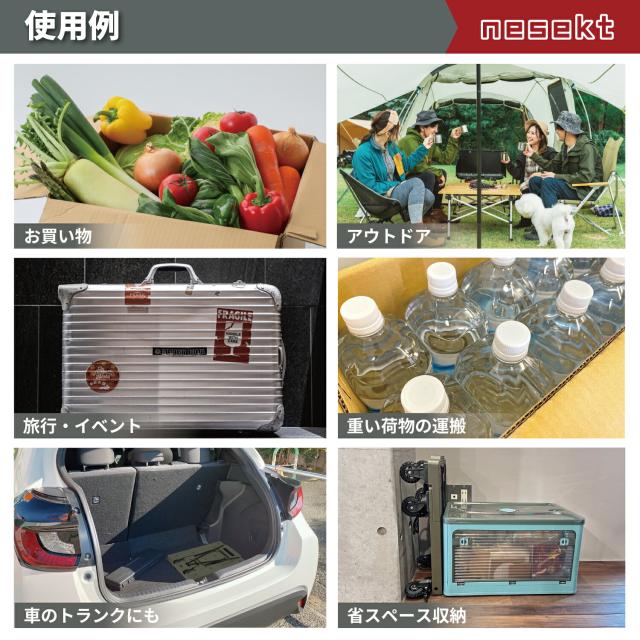 宅配物や買い物品などの荷物、家具、クーラーボックス、ポリタンクなどの重い荷物も軽々と運べます。アウトドア、引越し、旅行、ショッピング、イベントなど様々なシーンで大活躍!