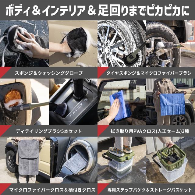 【高機能&高品質&アウトドアデザイン】 機能性もデザインも使いやすさも考え抜いた、こだわりの洗車セットです。 気持ちよく洗車をして頂きたいという思いからスタイリッシュなアウトドアデザインにこだわりました。