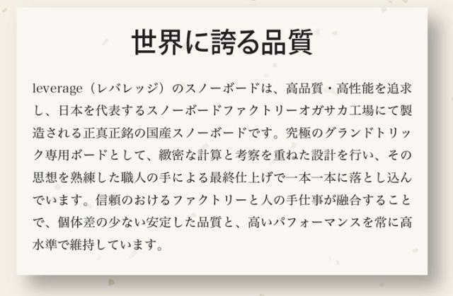 leverage(レバレッジ)のスノーノードは、その全てが高品質・高性能を追求し、日本を代表するスノーボードファクトリーである「オガサカ工場」で製造される、正真正銘の国産ボードです。