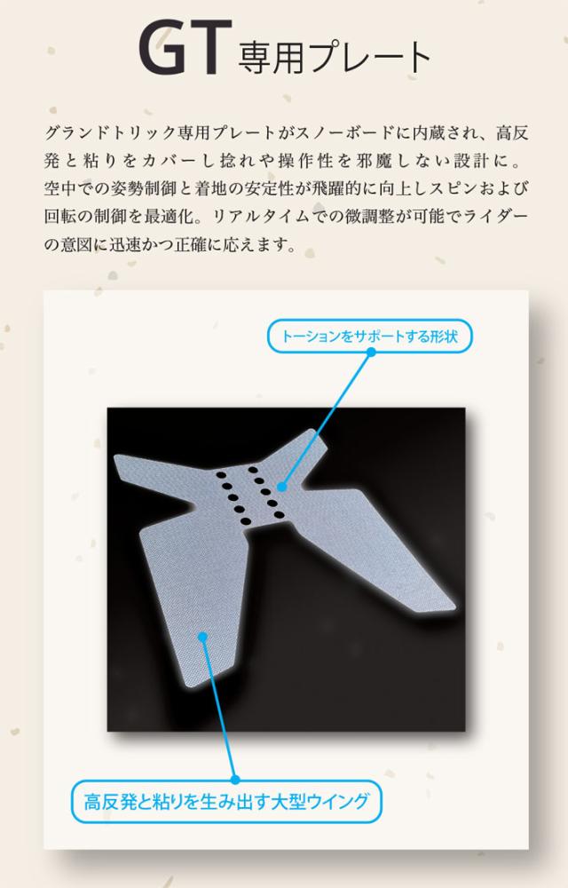 グランドトリック専用プレートがスノーボードに内蔵され、高反発と粘りをカバーし捻れや操作性を邪魔しない設計に。