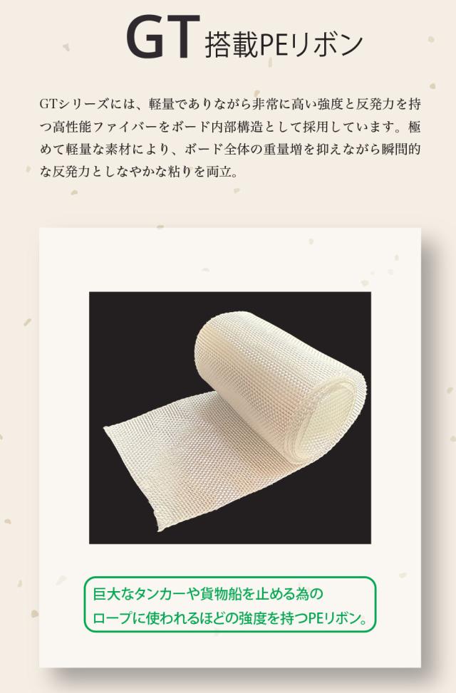 GTシリーズには、軽量でありながら非常に高い強度と反発力を持つ高性能ファイバーをボード内部構造として採用しています。