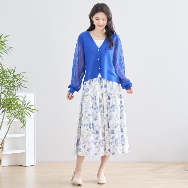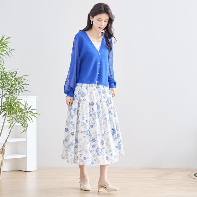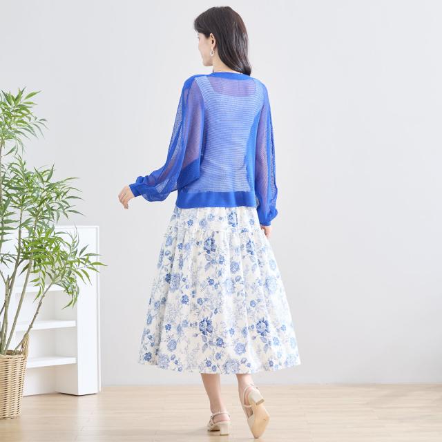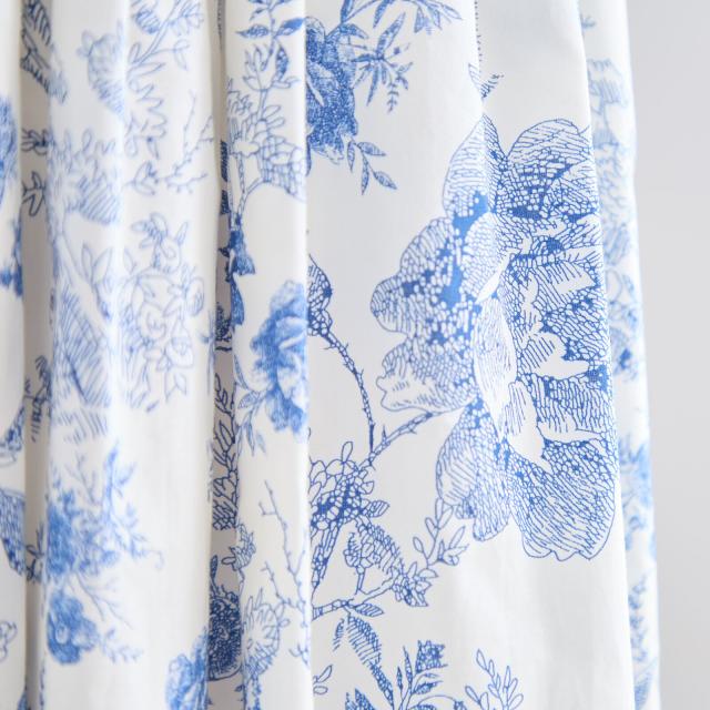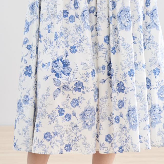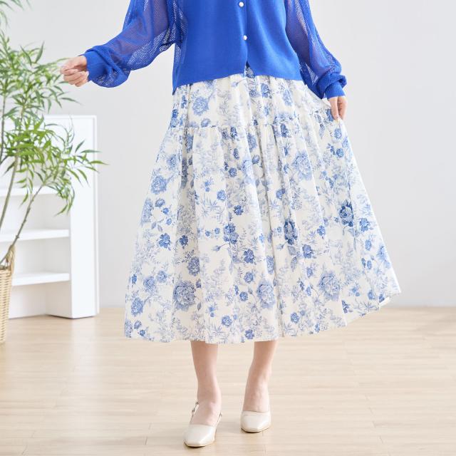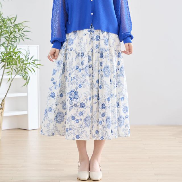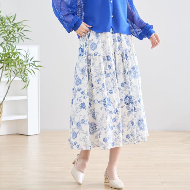 白×ブルーの夏らしいナチュラルで上品な雰囲気に仕上げたスカート。ふんわり広がるシルエットが軽やかな動きを演出します。ウエストはゴム仕様でリラックスしたはき心地も魅力です。