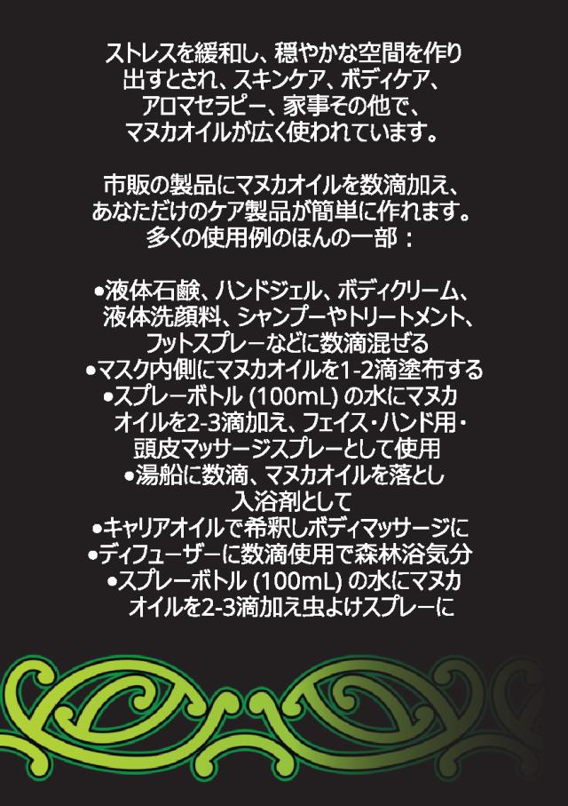 ◆ストレスを緩和し穏やかな空間を作り出すとされ、スキンケア、ボディケア、アロマセラピー、家事その他でマヌカオイルが広く使われています。