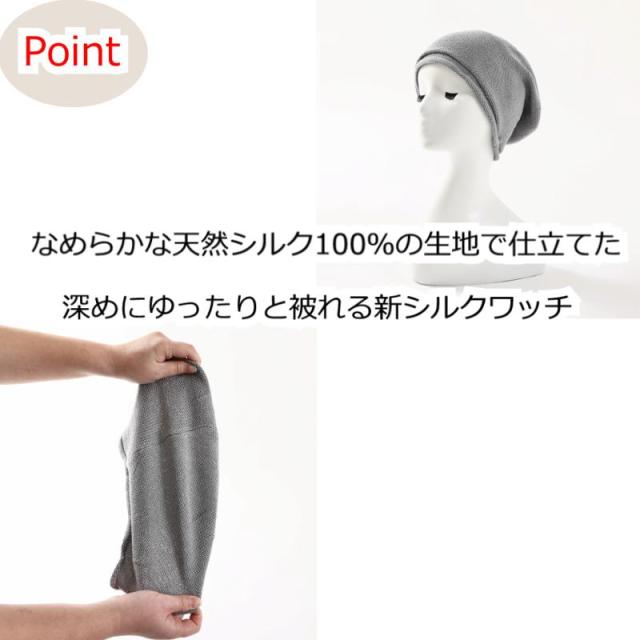 深めにすっぽり、シルク100%。背面の縫い目でシルエットをキープする、安定感重視のゆったりワッチ。深めにかぶれる大きめ採寸のシルクワッチ 新シルクニット帽子