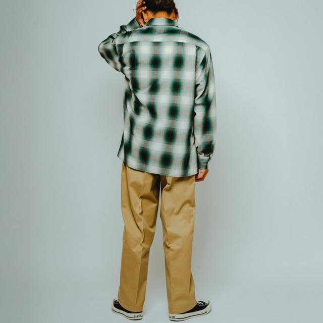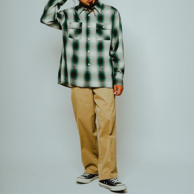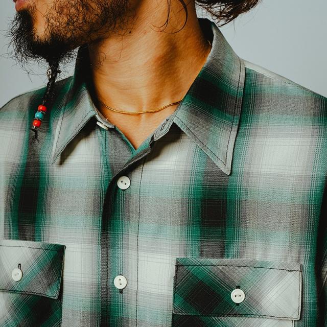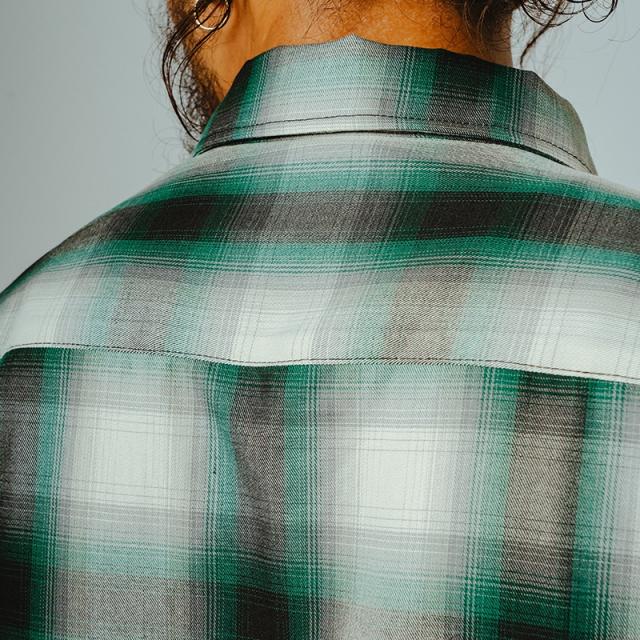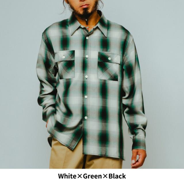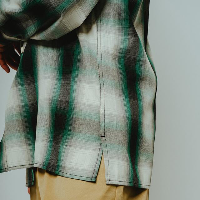 RAYON MIX OMBRE SLIT L/S SHIRTS 春秋のレイヤードに映える滑らかな素材感とヴィンテージライクな表情を兼ね備えた一着。 落ち感のあるレーヨン混生地と奥行きのあるオンブレチェックが、大人のストリートスタイルに自然に馴染みます。