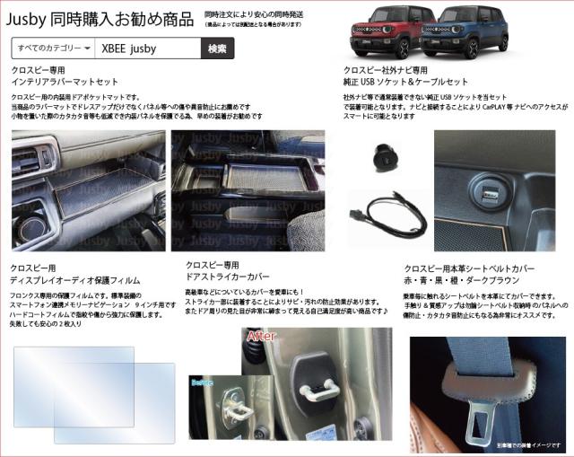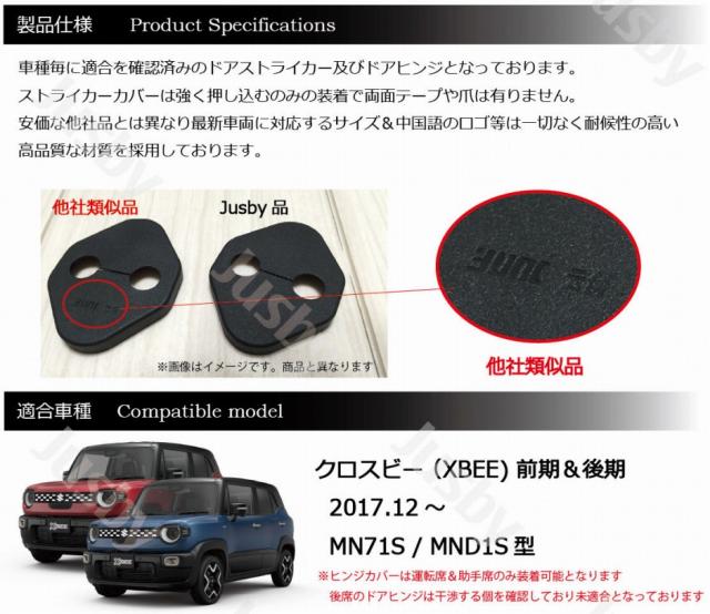 | クロスビー専用ドアカバー(カーボン柄 or ノーマル)です。 2017年8月発売のクロスビー (MN71S/MND1S型) に適合します。 クロスビー専用の1台分のドアストライカーカバー4個&ヒンジカバー2個(運転席&助手席用)になります。 【注意事項】 ・当商品のヒンジカバーは運転席&助手席のみ装着可能となります。後席ドアヒンジは干渉する事を確認しており未適合となっております 通常むき出しで味気ないドアストライカーに被せるだけでドア周りが締まった印象になります。 決して主張すること無いパーツですが分かる人にはわかる?自己満足度の高い製品です。 またストライカー部に汚れや錆等が付くことを抑制できます。 当商品は安価な他社製にあるロゴ等は一切なく純正ルックに装着可能です。 商品にはJusby保証付きです。割れや破損等は装着からの年数に関係無くに保証対応いたしますのでご安心してお買い求めください。またPL保険加入済みです(日本国内利用に限ります) ノーマルタイプは純正ルックでさり気なく、カーボン柄タイプはアクセントプラス出来ます。 お好みのタイプを選んでから御注文ください。 スタッフレビュー 純正ルックで付いている事がわからない?逆に付いてないと気になる部分です。 装着するだけでホコリや錆から守り、ドレスアップ! 自己満足度の高い商品です。 ディーラーの営業さんだけは気付いてくれました |