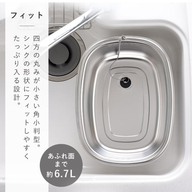 四方の丸みが小さい角小判型で、シンクの形状にフィットしやすくたっぷり入る設計(あふれ面まで約6.7L)。
