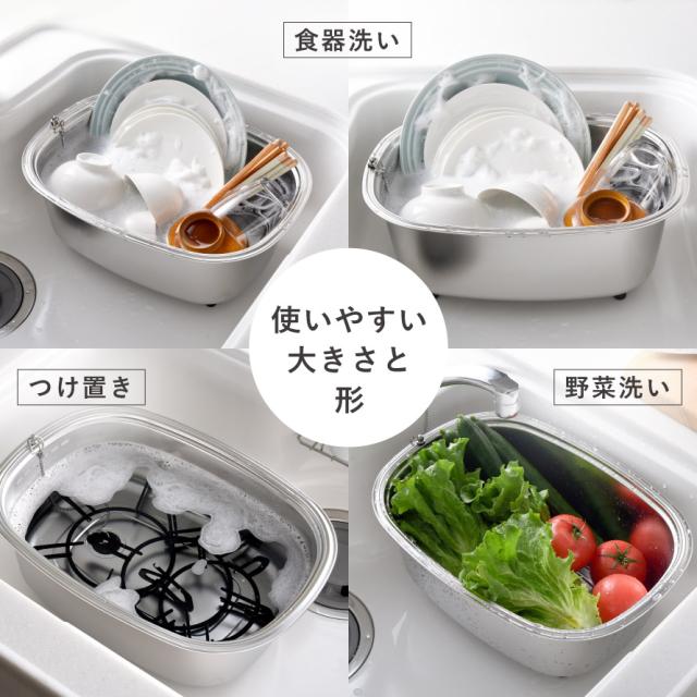 食器や鍋のつけ置き洗い、野菜や果物の下処理、キッチン小物のまとめ洗いに便利。