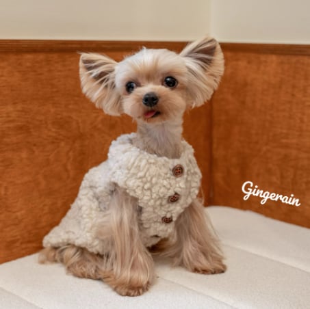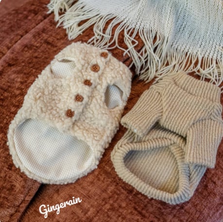 もこもこ素材とニットの組み合わせが可愛い、冬にぴったりの犬用セーター。胸元のボタンがアクセントになり、ナチュラルでおしゃれな印象を演出します。保温性に優れたボア風デザインで、寒い日のお散歩やお出かけに最適。