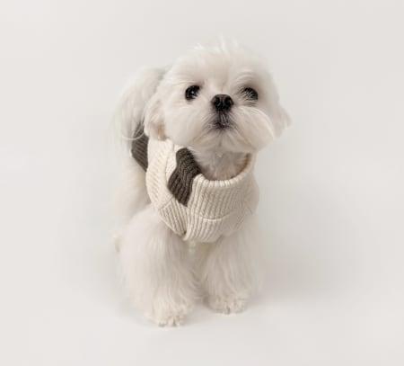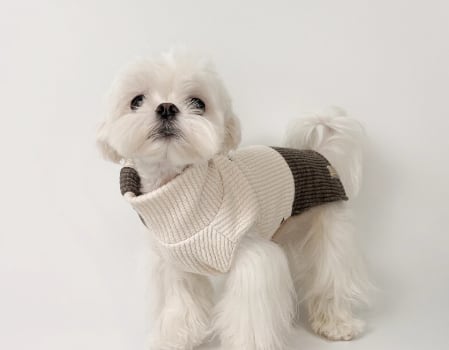 ベージュとブラウンのバイカラーが大人っぽくおしゃれな犬用セーター。伸縮性のある柔らかいニット素材で、ワンちゃんの体を優しく包み込み、寒い季節のお散歩やお出かけに最適です。シンプルながらも上品なデザインで、日常使いはもちろん、撮影やイベントにも大活躍します。