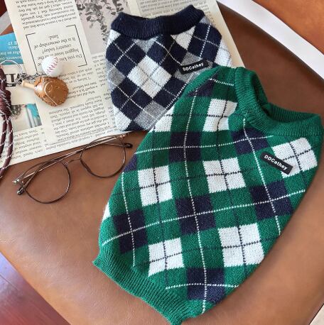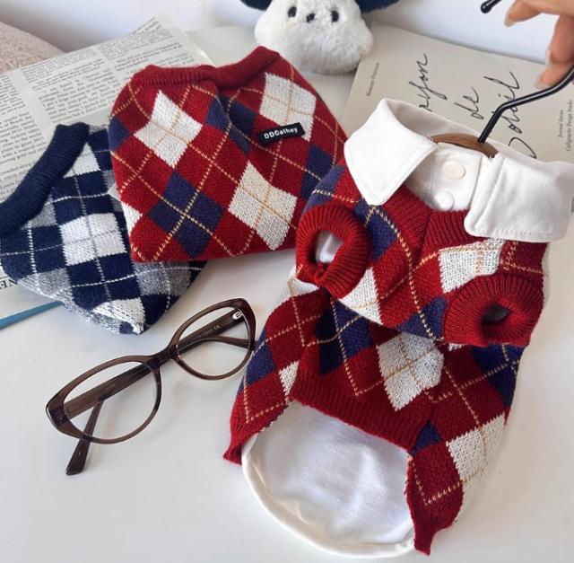 犬服 ニット セーター アーガイル柄 秋冬 小型犬 中型犬 おしゃれ かわいい 防寒 トイプードル チワワ マルチーズ ダックス ビションフリーゼ ペットウェア 犬用 洋服 暖かい カーディガン風