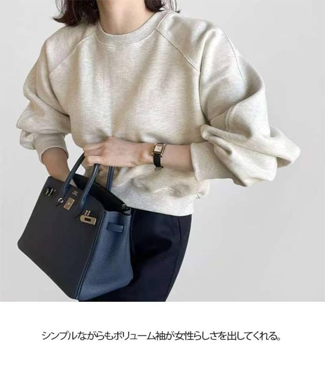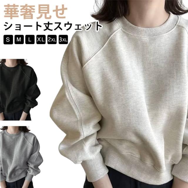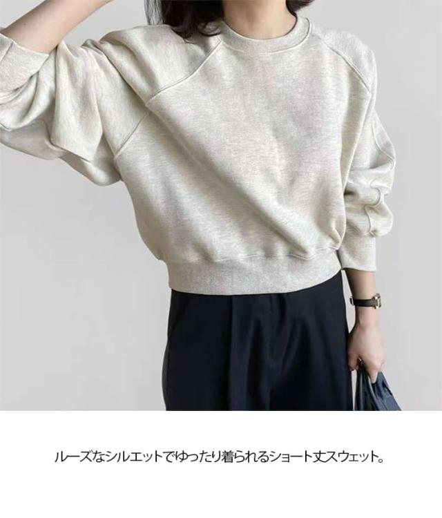 トップス ショート丈 スウェット レディース プルオーバー 長袖 ボリューム袖 オーバーサイズ ゆったり ドロップショルダー 着心地良い 春 リラックス シンプル 体型カバー おしゃれ 着回し ロングシーズン 黒 ブラック グレー ショート丈スウェット 秋