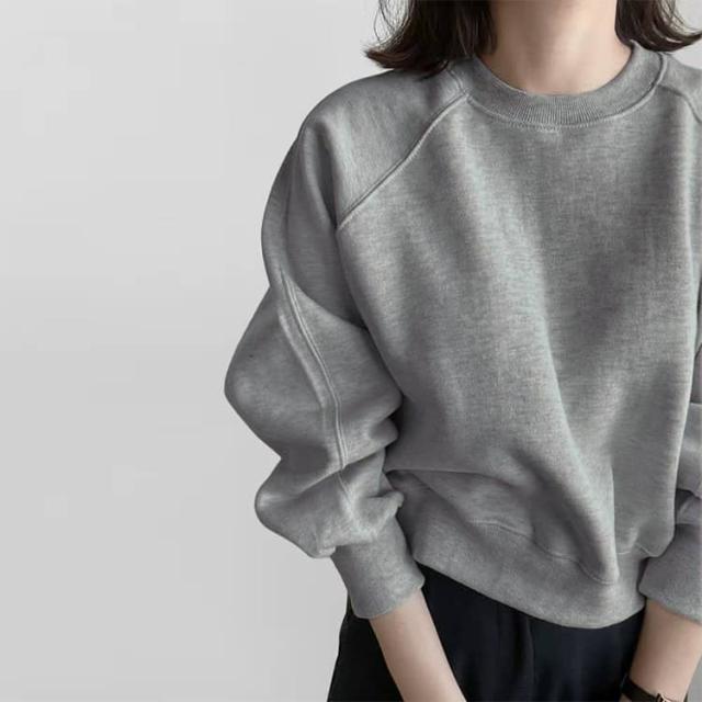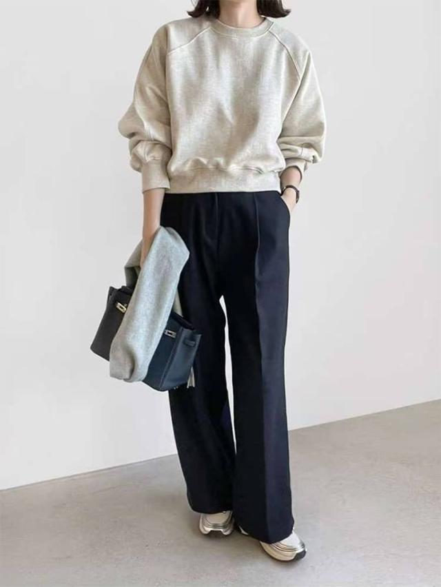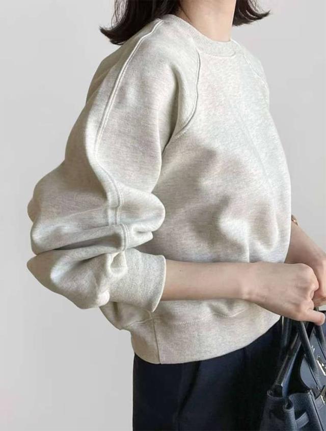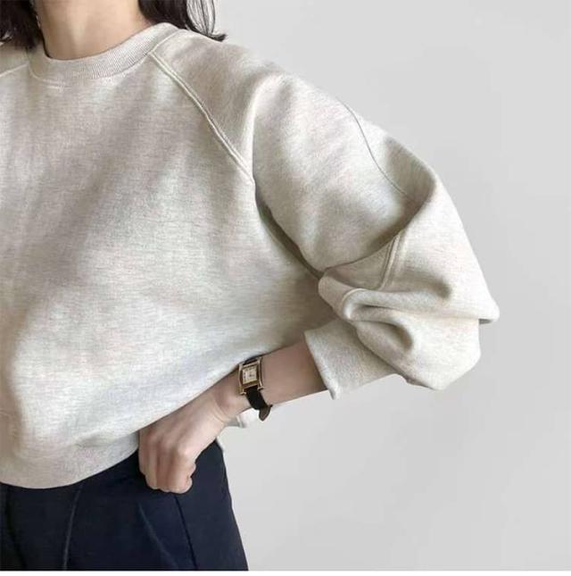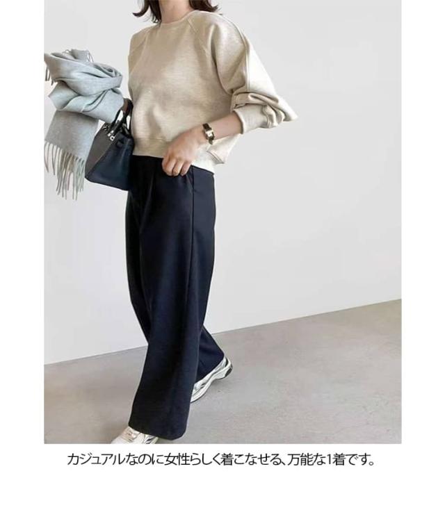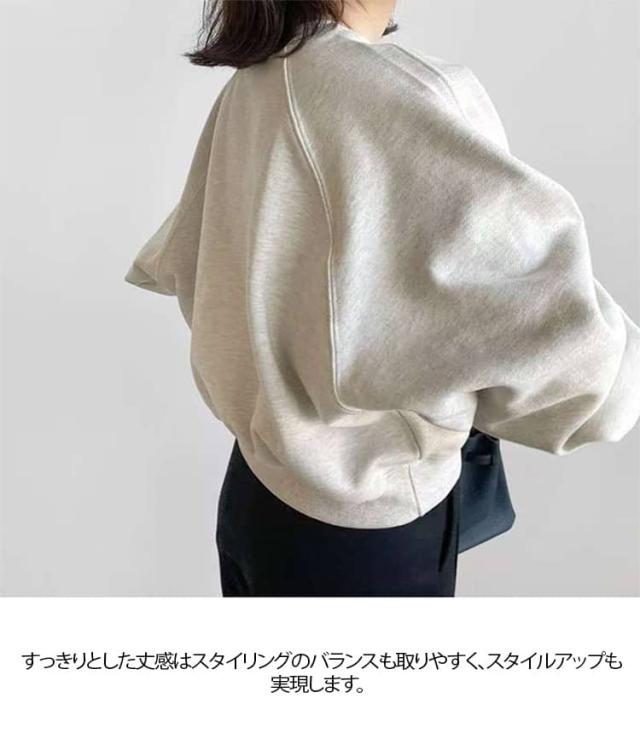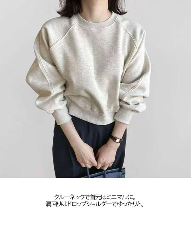 | ショート丈スウェット 華奢見せ 3色 S−XL ルーズなシルエットでゆったり着られるショート丈スウェット。 シンプルながらもボリューム袖が女性らしさを出してくれる。 クルーネックで首元はミニマルに。肩回りはドロップショルダーでゆったりと。 すっきりとした丈感はスタイリングのバランスも取りやすく、スタイルアップも実現します。 程よい厚みの素材で1枚ではもちろん、アウターを羽織ったりパンツにタックインしてもごわつかない。 カジュアルなのに女性らしく着こなせる、万能な1着です。 | |
