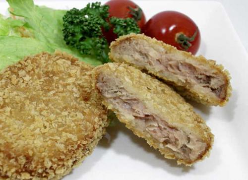 ■原材料: 豚肉、牛肉、たまねぎ、パン粉、砂糖、牛乳、しょうゆ、バター、食塩、香辛料、衣(パン粉、小麦粉、米粉、食塩)