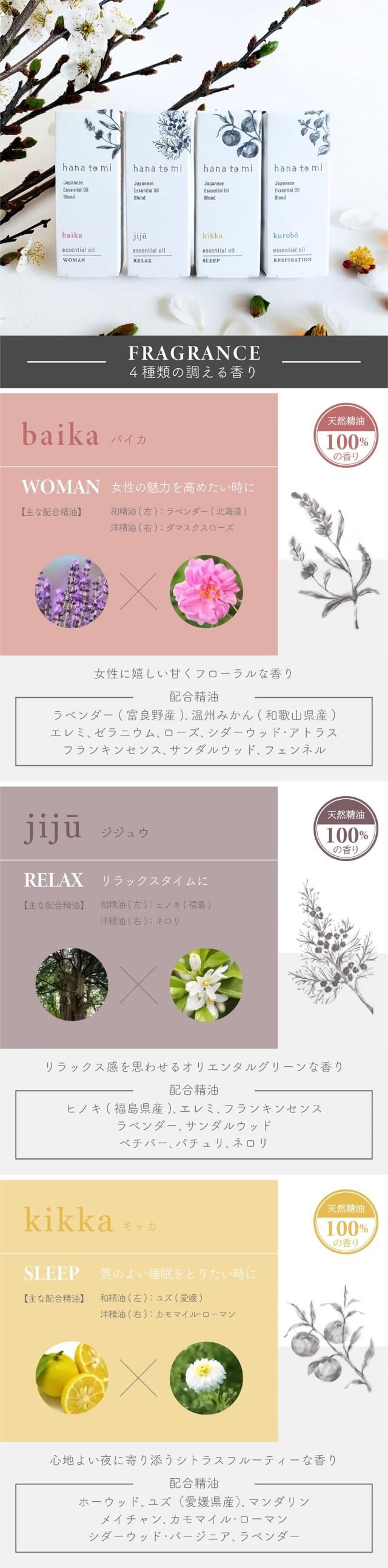 ラベンダー,温州みかん,エレミ,ゼラニウム ローズ,シダーウッド・アトラス フランキンセンス,サンダルウッド,フェンネル <jiju> ヒノキ,エレミ,ラベンダー,フランキンセンス ベチバー,サンダルウッド,パチュリ,ネロリ <kikka> ホーウッド,マンダリン,メイチャン,ユズ カモマイル・ローマン,シダーウッド・バージニア ラベンダー <kurobo> 薄荷(北海道産),ユーカリ・グロブルス, ラベンダー・スパイク,トドマツ(北海道産) |