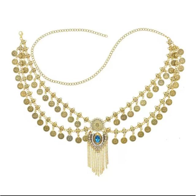 ゴールド色 ウエストチェーン ストーン付き ベリーダンス コインベルト 青い目チャーム ジプシー風 ボヘミアン 衣装 アクセサリー 腰アクセサリー