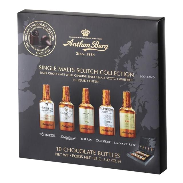 デンマーク王室御用達の歴史のあるチョコレートブランド『アンソンバーグ』は、良質のカカオ豆を使用し、伝統的な製法でチョコレートを作り続け、高い評価を得ています。特にボトルシェイプのダークチョコレートに、砂糖などでコーティングをせず、そのままウィスキーを入れた「ウィスキーアソート」はアンソンバーグの大人気商品として世界中で親しまれています。自分用にも、贈り物用にもおすすめな逸品です。世界的に有名な5種類のシングルモルトスコッチウィスキー(シングルトン、ダルウィニー、オーバン、タリスカー、ラガヴーリン)をダークチョコレートに閉じ込めました。 芳醇な味わいが楽しめる大人のチョコレートです。10個入り。