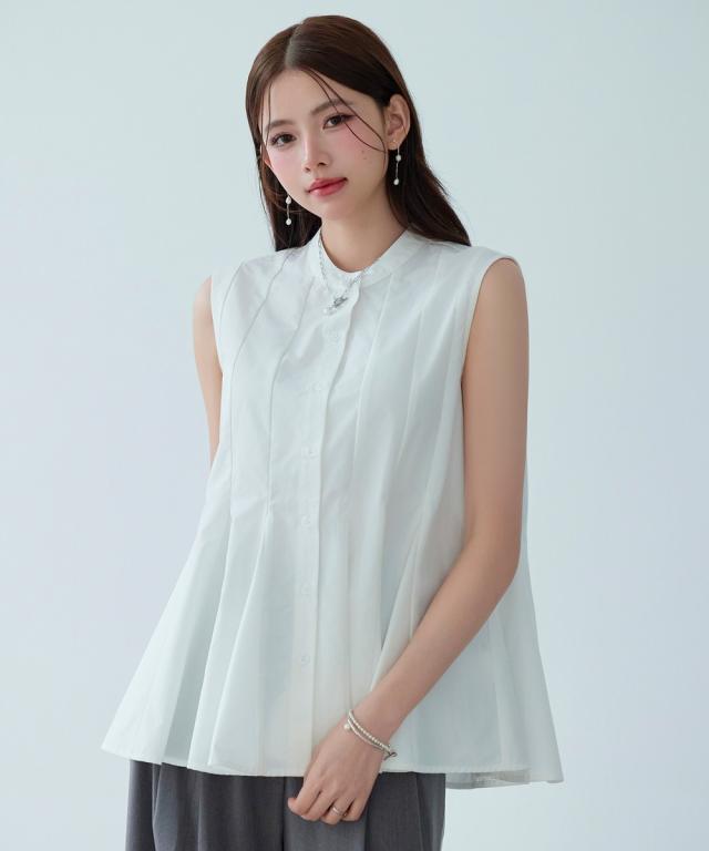 上品なフレアシルエットのノースリーブシャツブラウス。