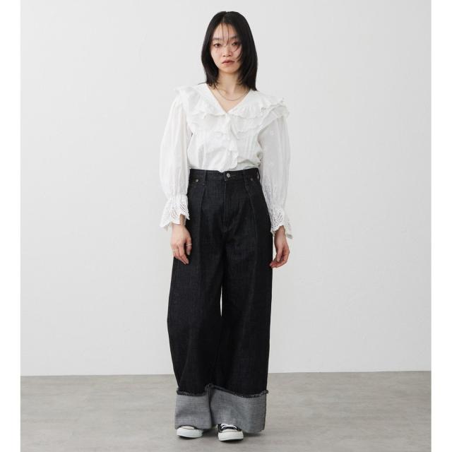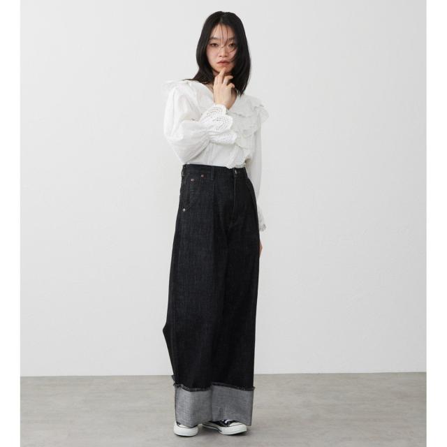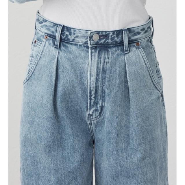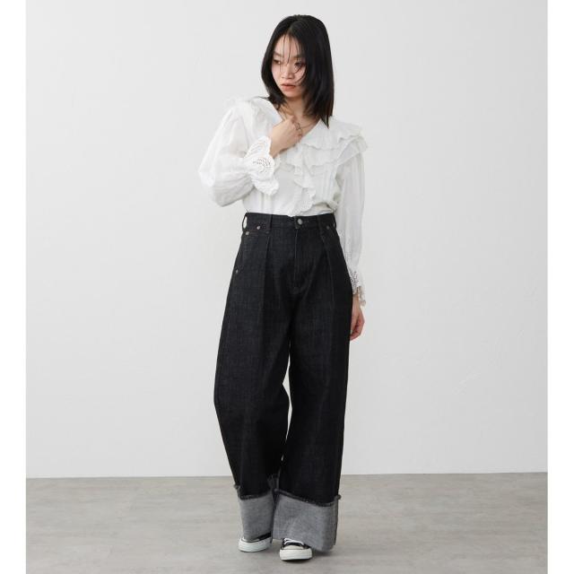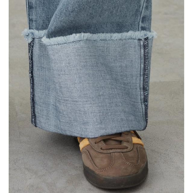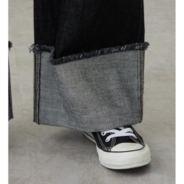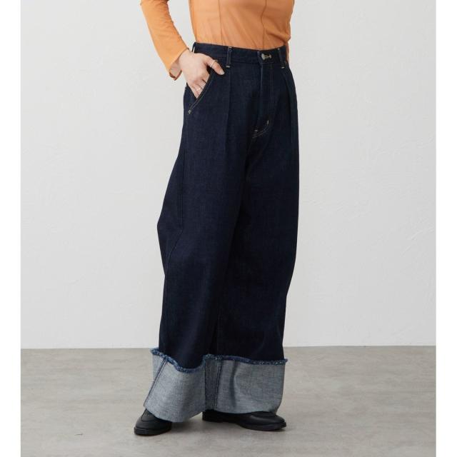 直線的でゆったりとした太めのシルエットが特徴のルーズストレート。裾に施した大きなロールアップのディテールがこのデニムのアイコン。ウエストにはタックを入れ立体的な見え方に。カジュアルなスタイリングに抜け感とモードな個性をプラスした映えアイテム。