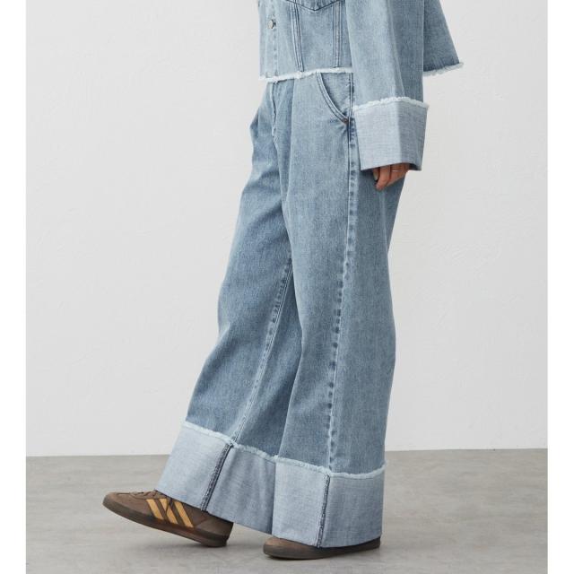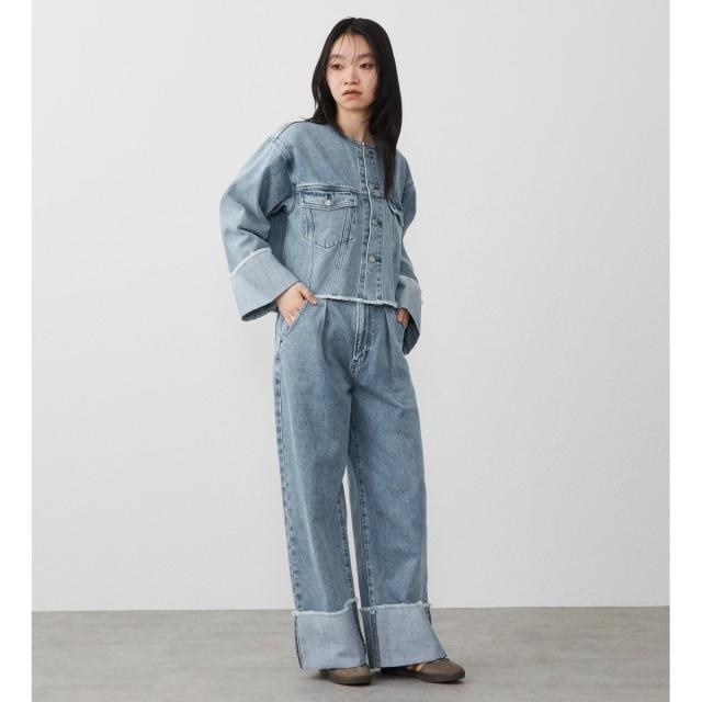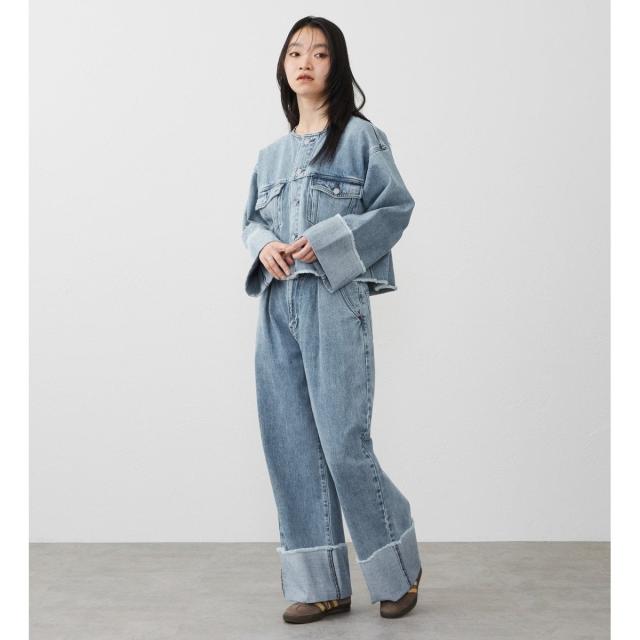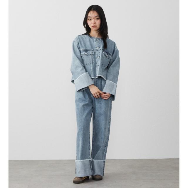 同じ素材を使用したロールアップのデニムジャケットと合わせるセットアップのコーディネートがおすすめ。上下セットで合わせれば一気にデニムコーディネート上級者に。足元には厚底シューズやフラットなローファーを合わせるのが◎セットアップでの着用はもちろん、タンクトップやタイトなトップスと合わせた単品着用でも自分好みに着まわせるアイテムです。