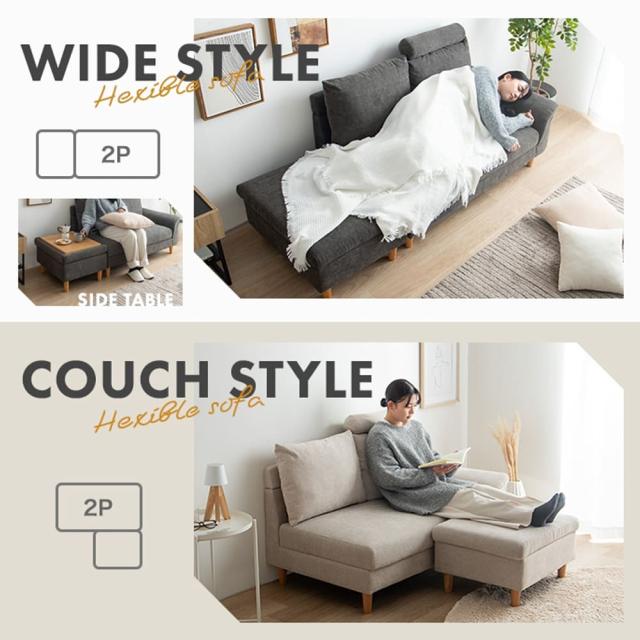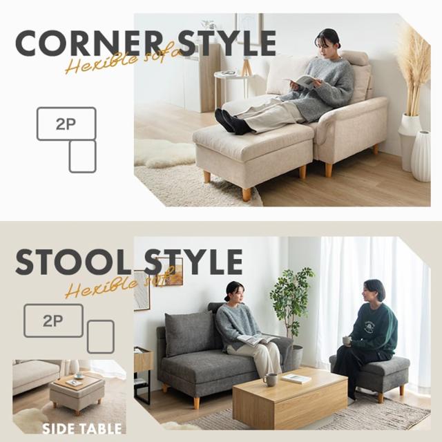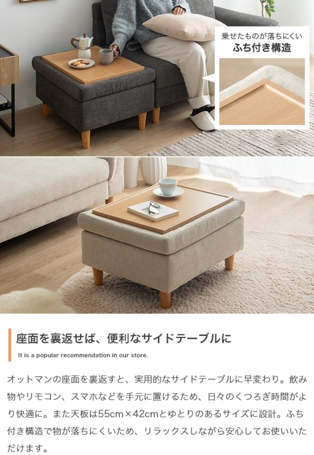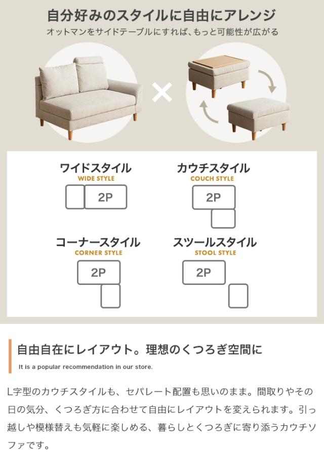 オットマンは座面を裏返すことでサイドテーブルとしても使用可能。飲み物やスマホ、リモコンを置ける便利な仕様です。さらにレイアウトは自由自在で、ワイドスタイルやカウチスタイル、セパレート配置など、暮らしに合わせて変えられます。省スペースでも快適に過ごしたい方におすすめのカウチソファです。