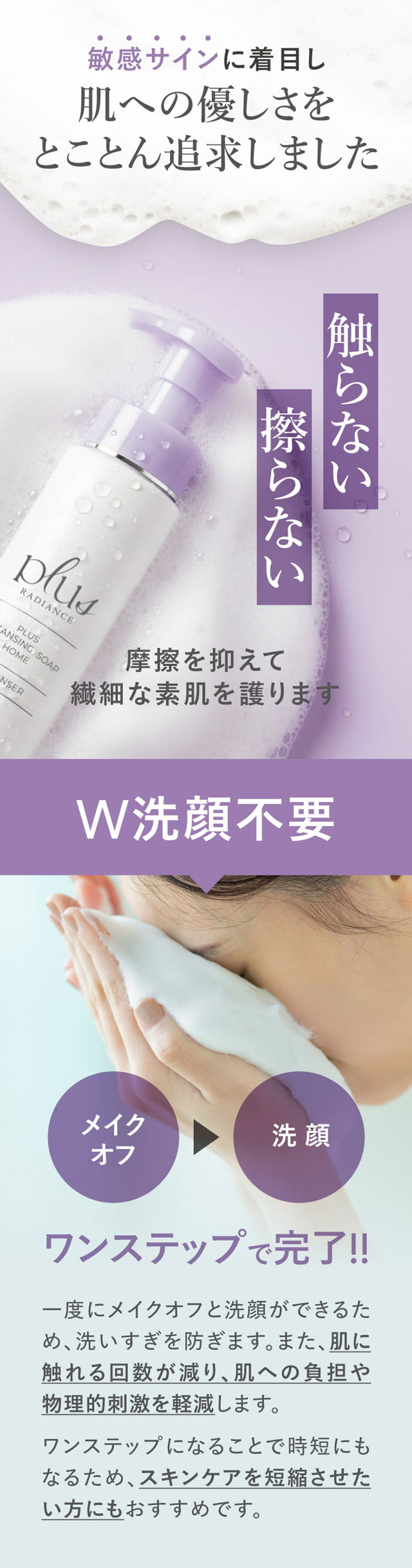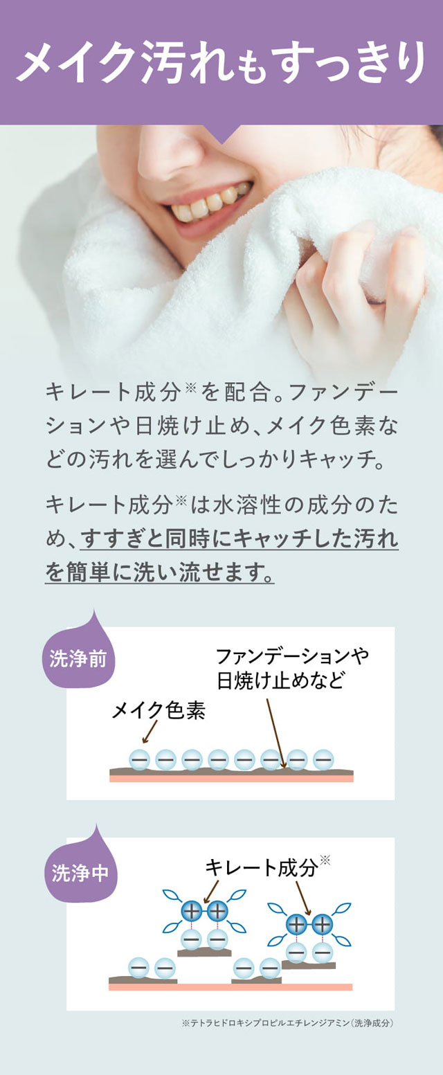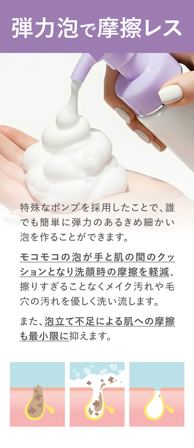 | 特徴 | 肌の敏感サインに着目し、肌への優しさをとことん追求したメイクも落とせる泡タイプの洗顔料です。 洗顔時の過剰な摩擦は、肌への負担となるとともに、さまざまな肌トラブルの原因となります。 メイクオフと洗顔をワンステップにしたことで洗いすぎを防いだり、肌に触れる回数が減ることで肌への負担や物理的刺激を軽減します。 特殊なポンプを採用したことで、誰でも簡単に弾力のあるきめ細かい泡を作ることができます。 モコモコの泡が手と肌の間のクッションとなり洗顔時の摩擦を軽減、擦りすぎることなくメイク汚れや毛穴の汚れを優しく洗い流します。 また、泡立て不足による肌への摩擦も最小限に抑えます。 素肌に寄り添う、いたわりクレンジングで 「触らない」「擦らない」摩擦を抑えて、繊細な素肌を護ります。 < こんな方におすすめ > ・さっぱり洗い上げたい方 ・普通肌、ベタつきが気になる方 ・W洗顔が面倒な方 ・肌が敏感で物理的刺激を抑えたい方 ・レーザー、光治療後など刺激を抑えたい方 |