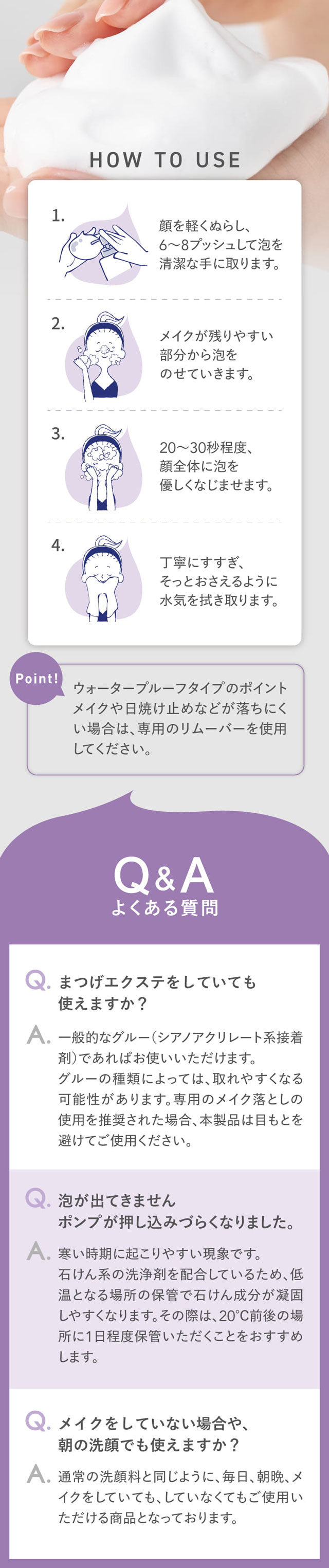 | 使用方法 | 顔を軽くぬらしてから、適量(6〜8プッシュ)を手に取り、泡をメイクになじませるようにして、やさしく洗顔してください。 洗顔後は、水またはぬるま湯でよく洗い流してください。 メイク落としと洗顔が一度でできます。 ※ウォータープルーフタイプのポイントメイクや日焼け止めなどが落ちにくい場合は、専用のリムーバーを使用してください。 |