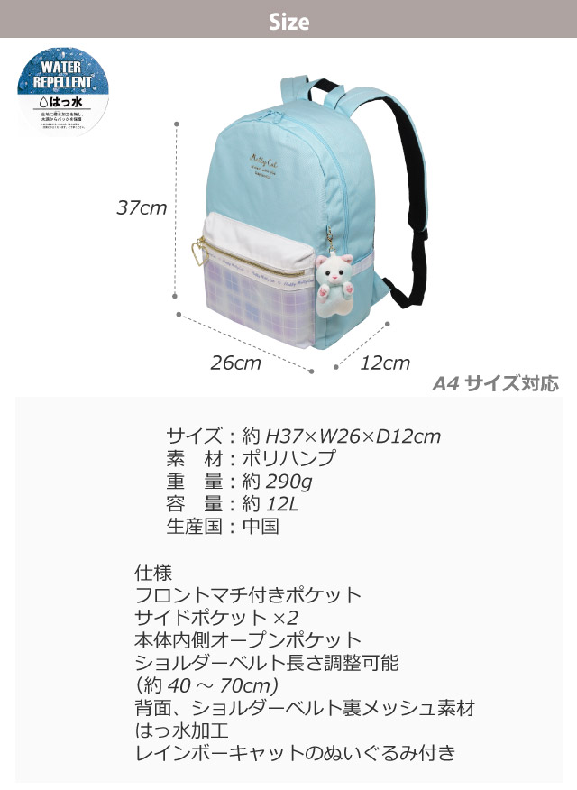 ![]() ![]() ![]() ![]() ・anilet アニレット チェックキャット ネコのマスコットチャーム付きでかわいいリュックサック。 小学生の女の子に人気です。 フロントのグラデチェックもポイント。 A4サイズ対応で収納力も抜群。 ちょっとした雨でも安心の撥水加工生地。 修学旅行・旅行・遠足・通園・通学・お出かけにおすすめ。