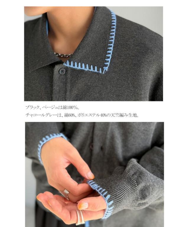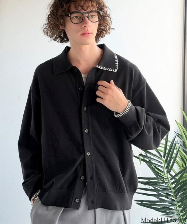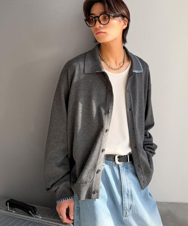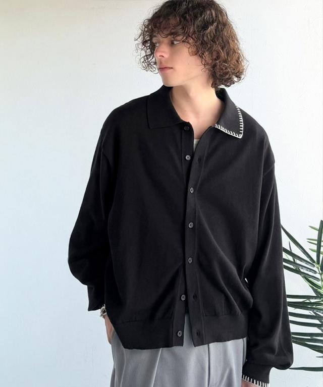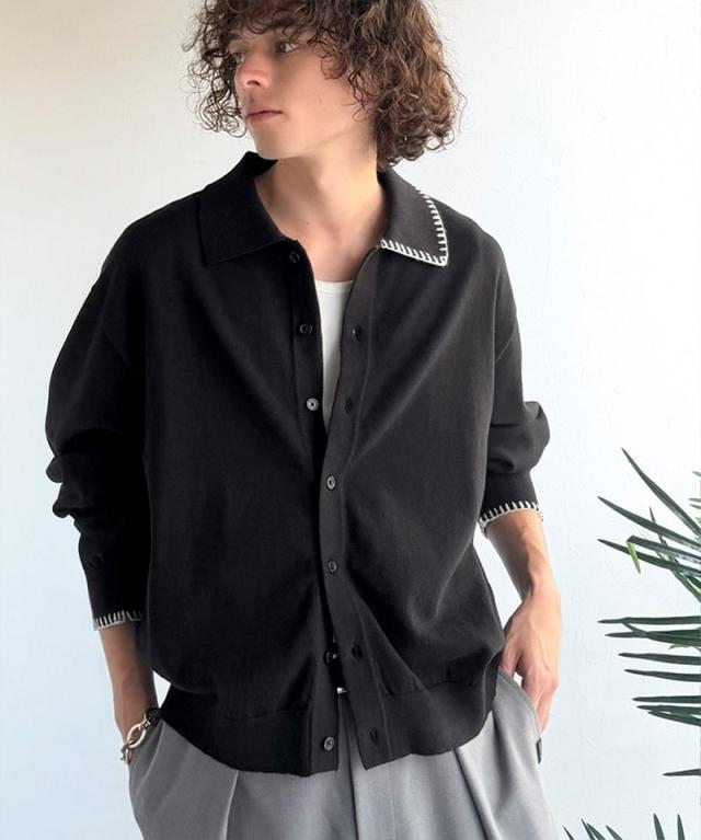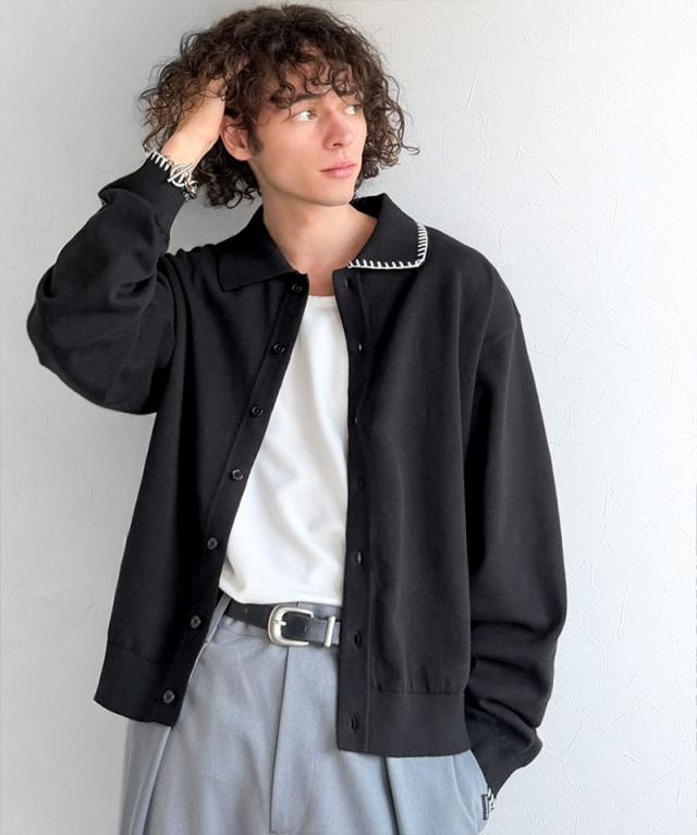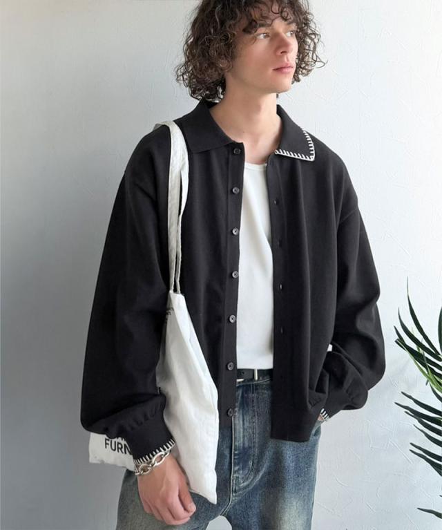 クラシカルエルフ春新作 java ジャバコラボ ニットシャツ メンズ 長袖 トップス シャツ カーディガン ステッチ 配色 ショート丈 ニットシャツ 羽織り レイヤードコーデ 大きいサイズ 黒 2026ss jo1150087