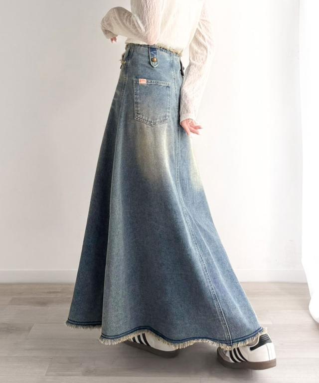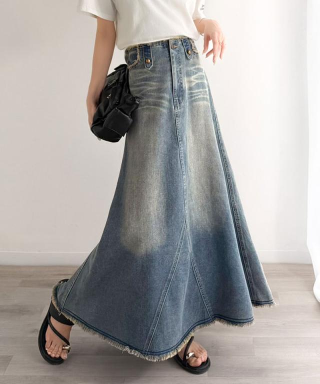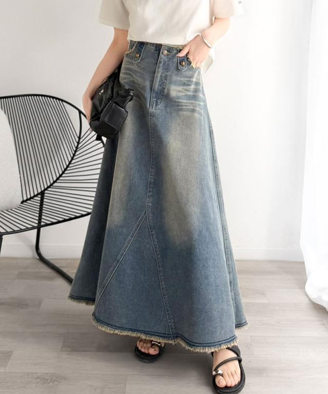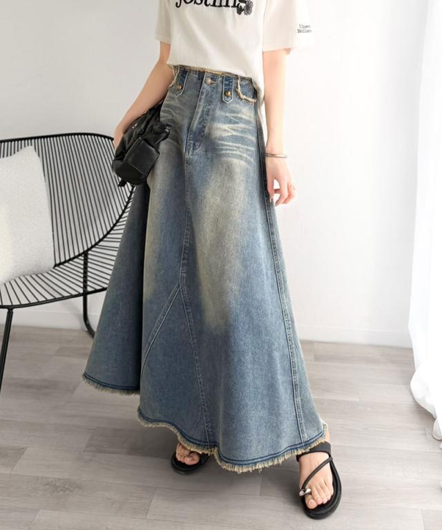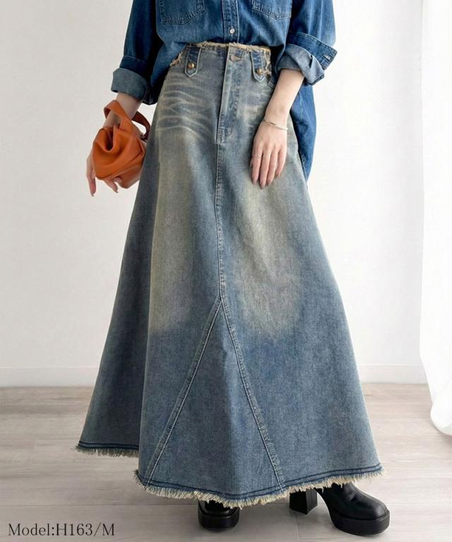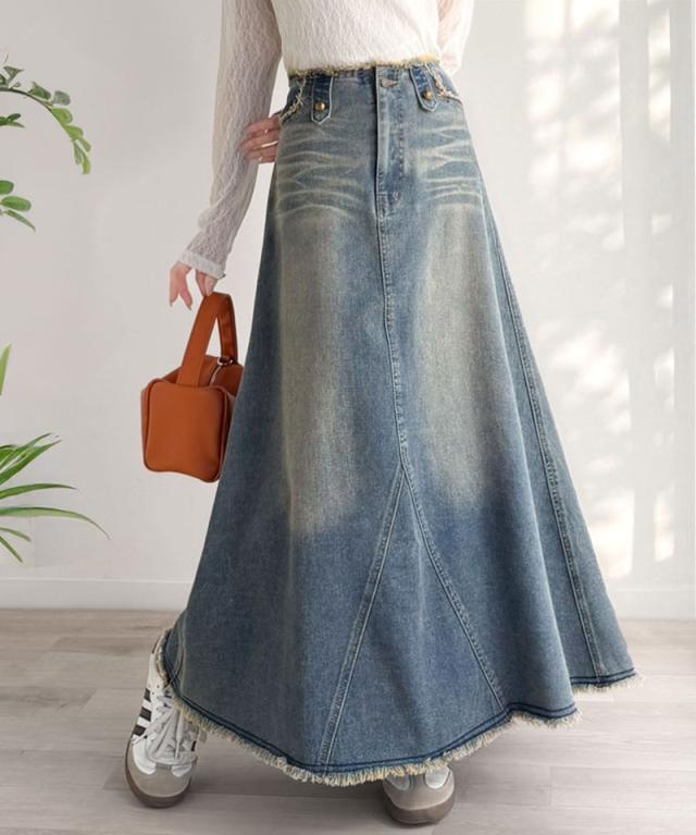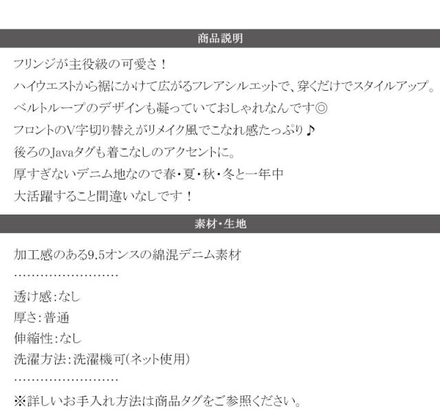 クラシカルエルフ春新作 java ジャバコラボ デニム スカート フレア ボトムス デニムスカート フリンジ ヴィンテージライク ロング フレアスカート お洒落 切替デザイン ハイウエスト 脚長視覚効果 綿混デニム素材 大きいサイズ 黒 2026ss jv1015097