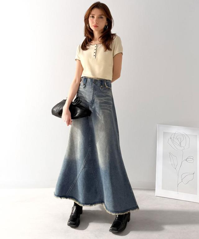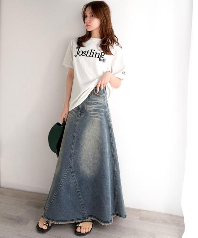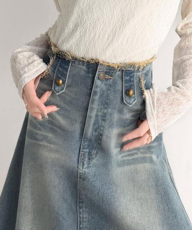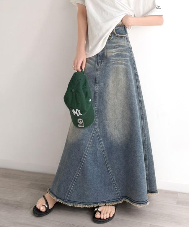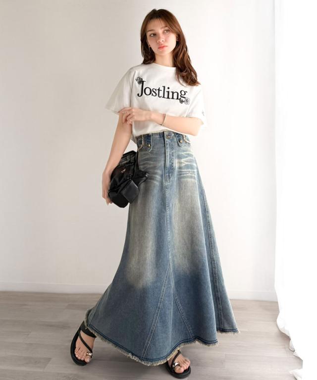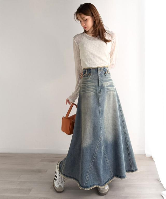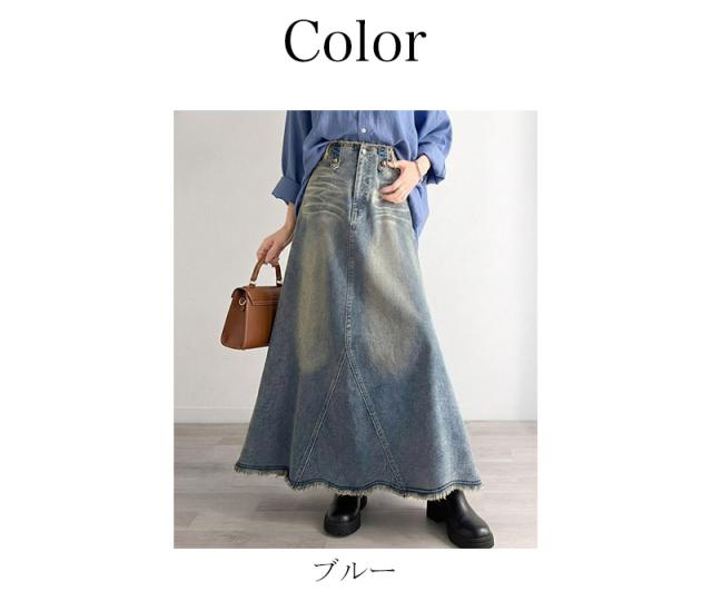 クラシカルエルフ春新作 java ジャバコラボ デニム スカート フレア ボトムス デニムスカート フリンジ ヴィンテージライク ロング フレアスカート お洒落 切替デザイン ハイウエスト 脚長視覚効果 綿混デニム素材 大きいサイズ 黒 2026ss jv1015097