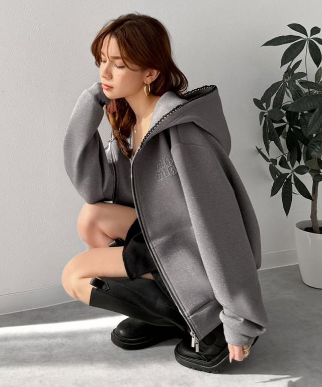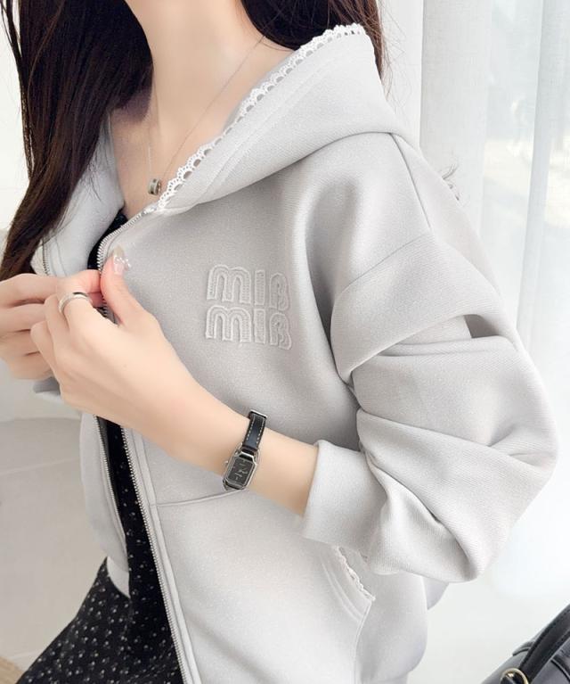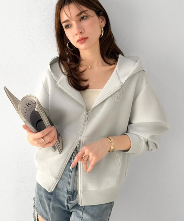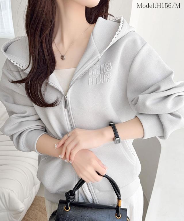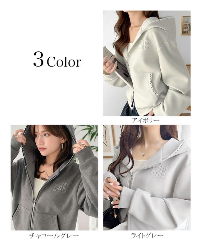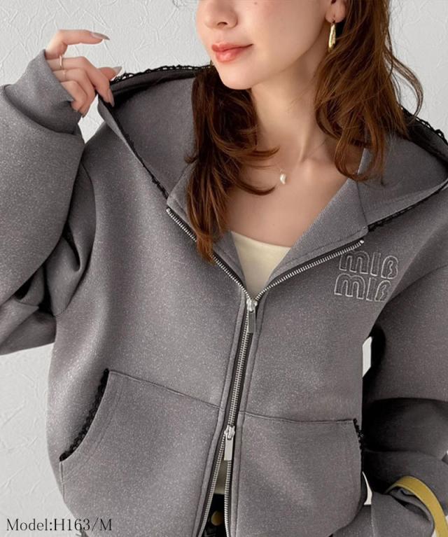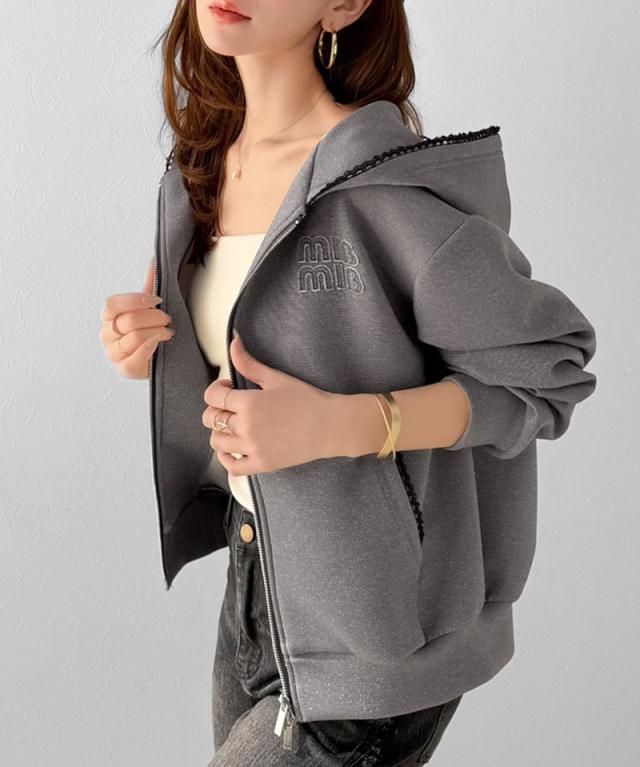 クラシカルエルフ春新作 mily bilet パーカー レディース トップス ショート丈 ダブルジップ ラメ ワッペン付き ピコレース キラリ 大人可愛い もっちり ダンボール生地 カジュアル 上品 スッキリ見え 華奢見え 大きいサイズ 2026ss mi1329094