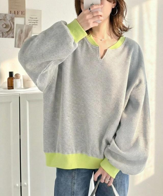 クラシカルエルフ春新作 ワッフル ロンT レディース トップス Tシャツ キーネック ゆったり オーバーサイズ 配色 プルオーバー 大きいサイズ 白 黒 2026ss ce1260612