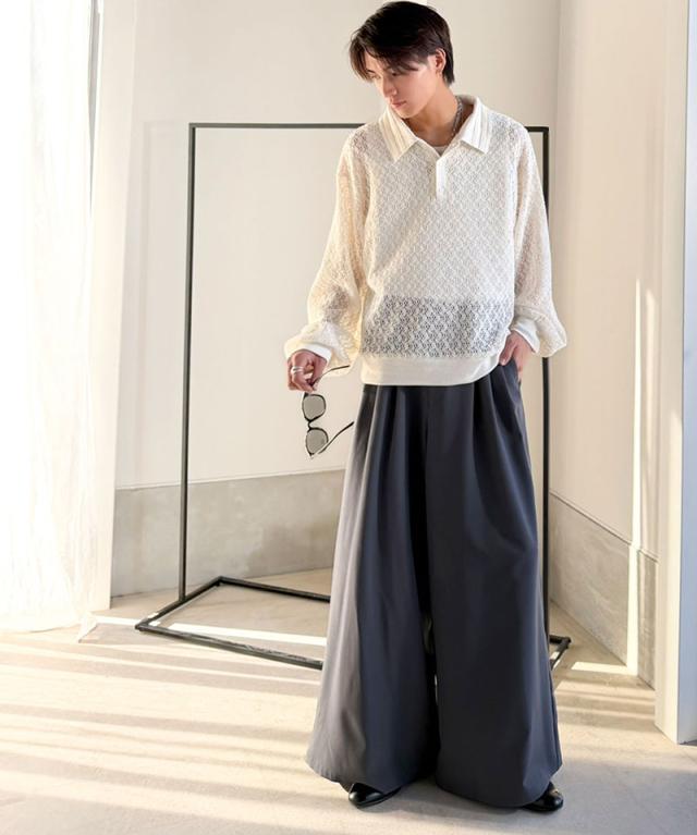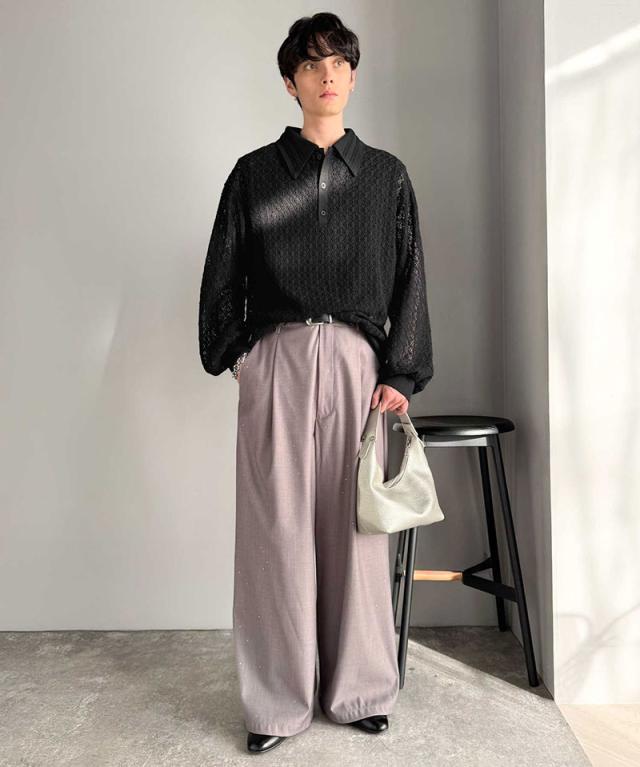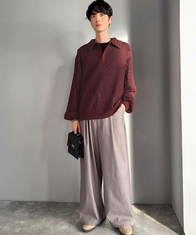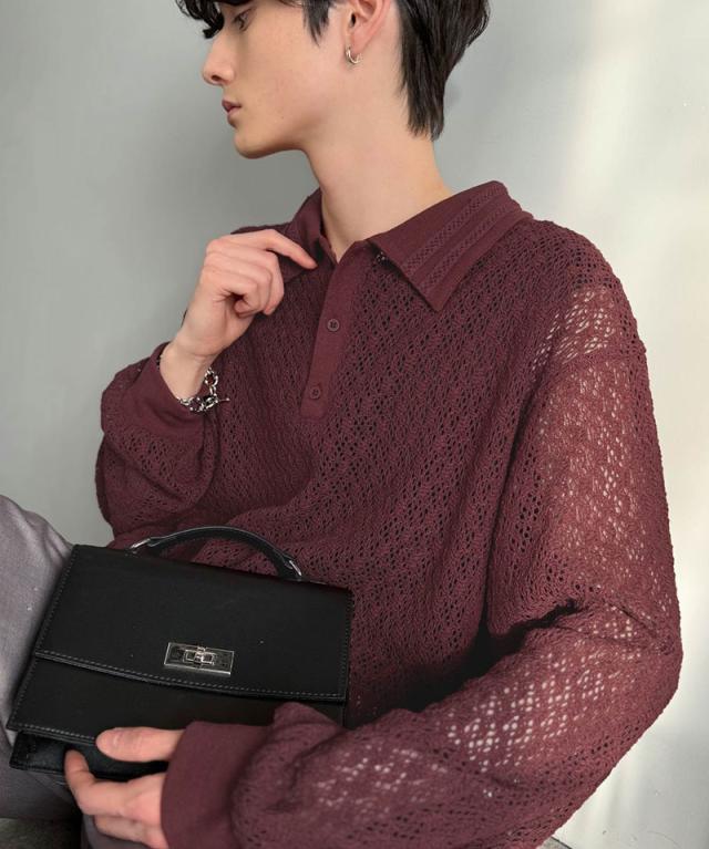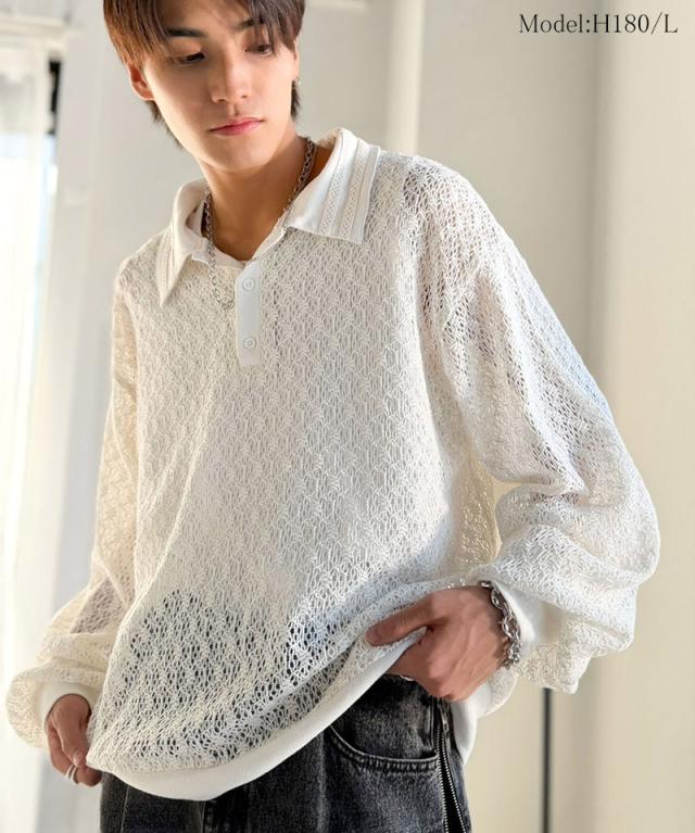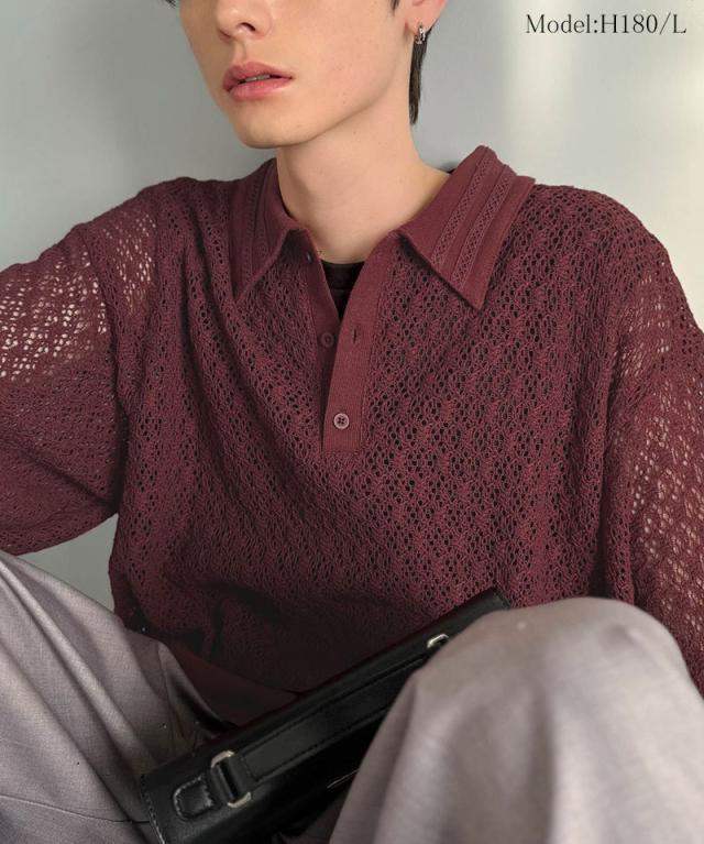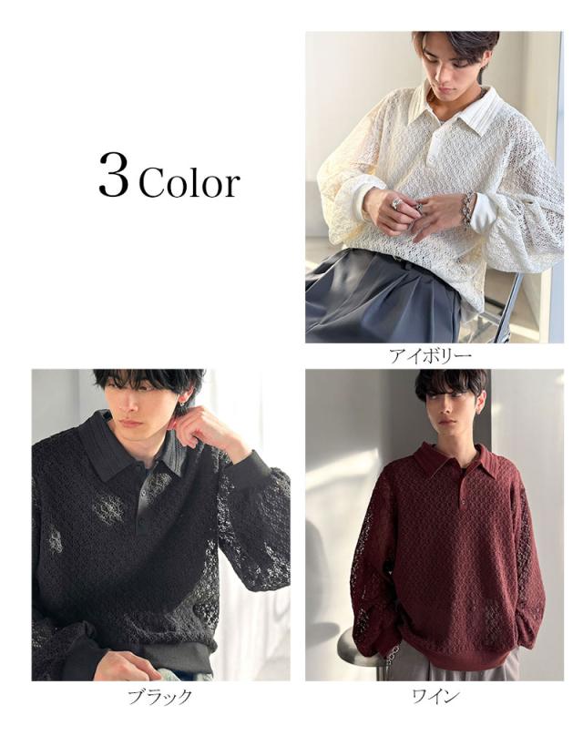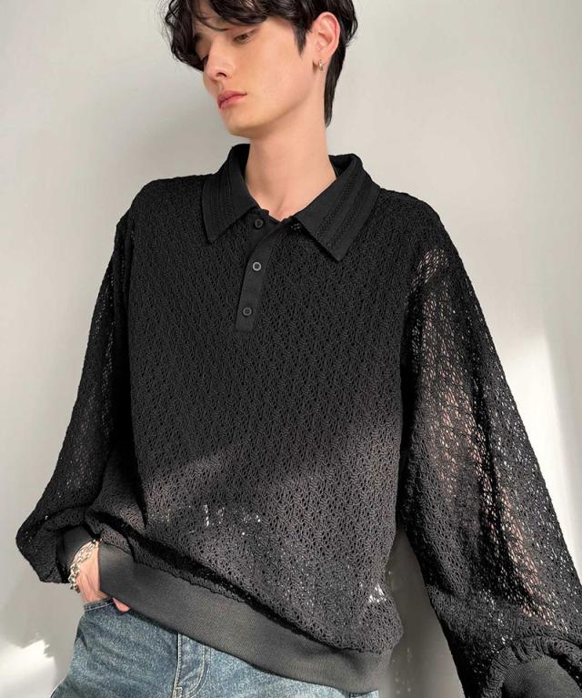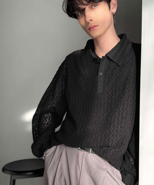 クラシカルエルフ春新作 Classical Origin ポロシャツ 長袖 メンズ おしゃれ トップス 繊細 レース柄 ニット 衿ダブルライン モード 存在感 立体的 程よい透け感 モードスタイル 軽やか 抜け感 カジュアル きれいめ ルーズ 大きいサイズ 黒 2026ss co1010049