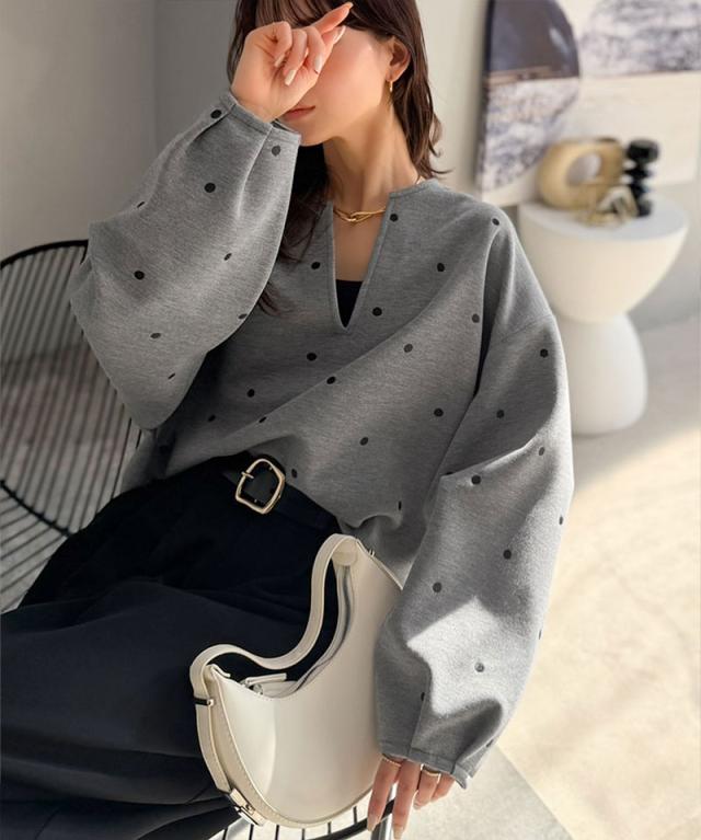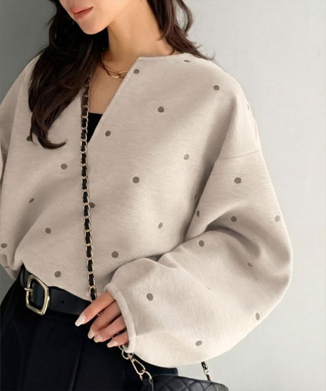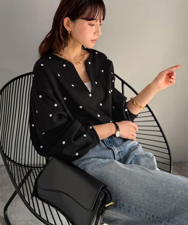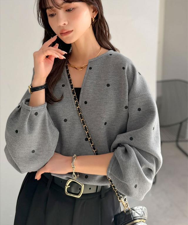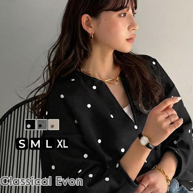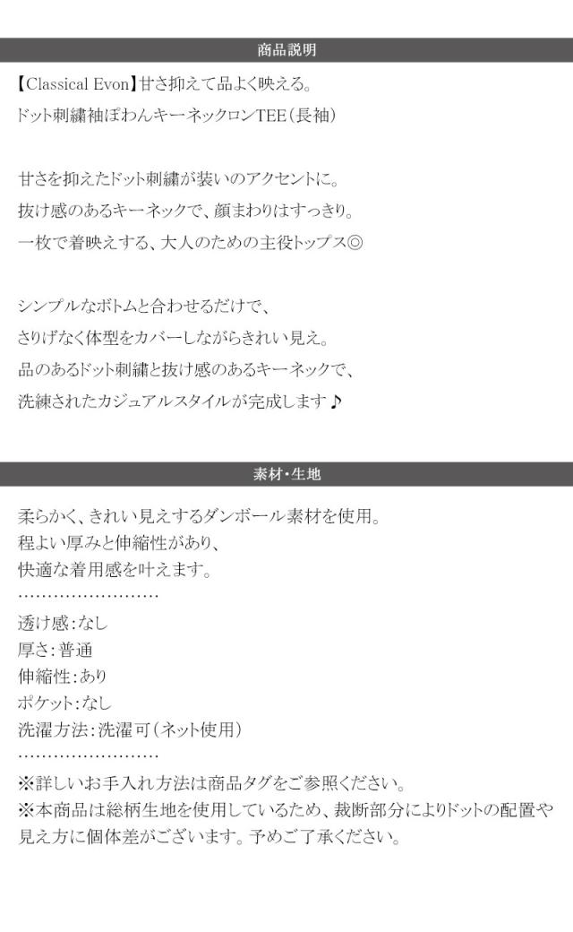 クラシカルエルフ春新作 Classical Evon ロンt レディース きれいめ トップス Tシャツ ドット 刺繍 袖 ぽわん キーネック 長袖 プルオーバー 大きいサイズ 黒 白 2026ss ev1260616
