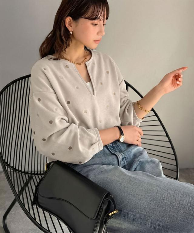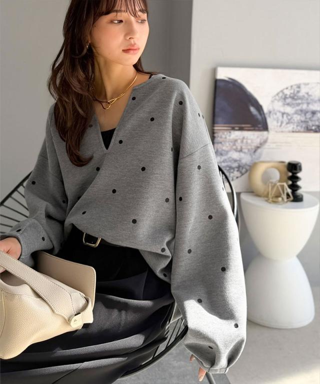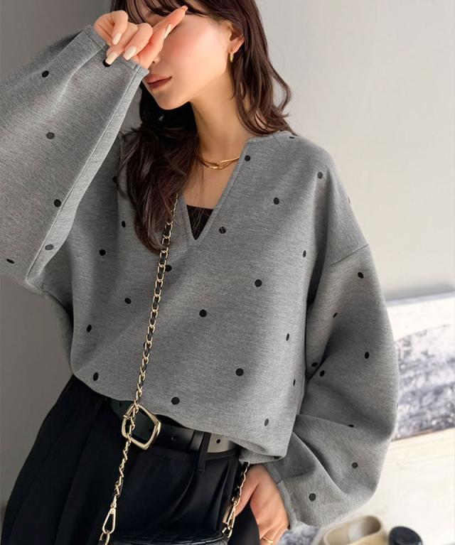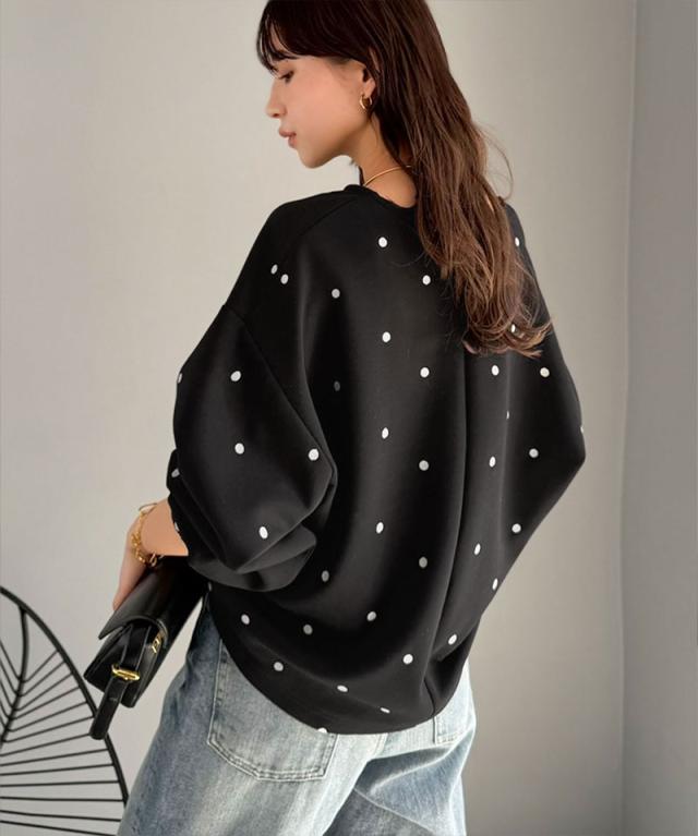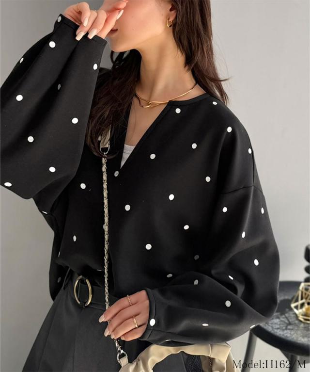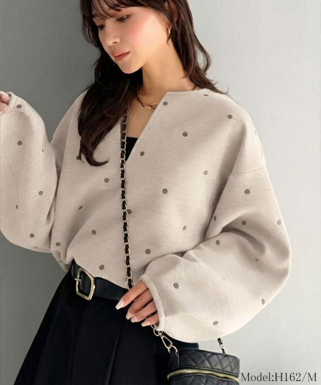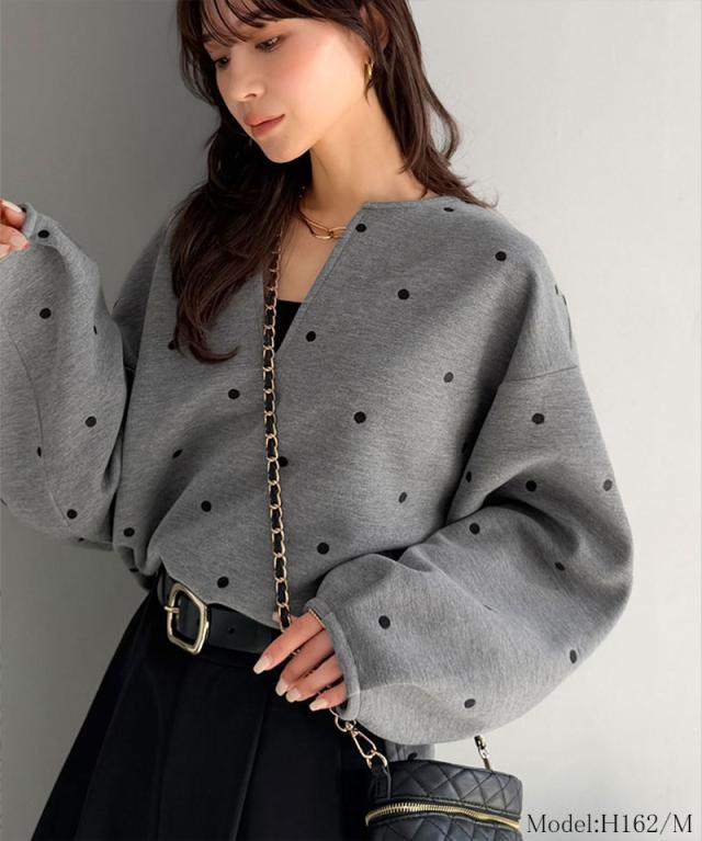 クラシカルエルフ春新作 Classical Evon ロンt レディース きれいめ トップス Tシャツ ドット 刺繍 袖 ぽわん キーネック 長袖 プルオーバー 大きいサイズ 黒 白 2026ss ev1260616