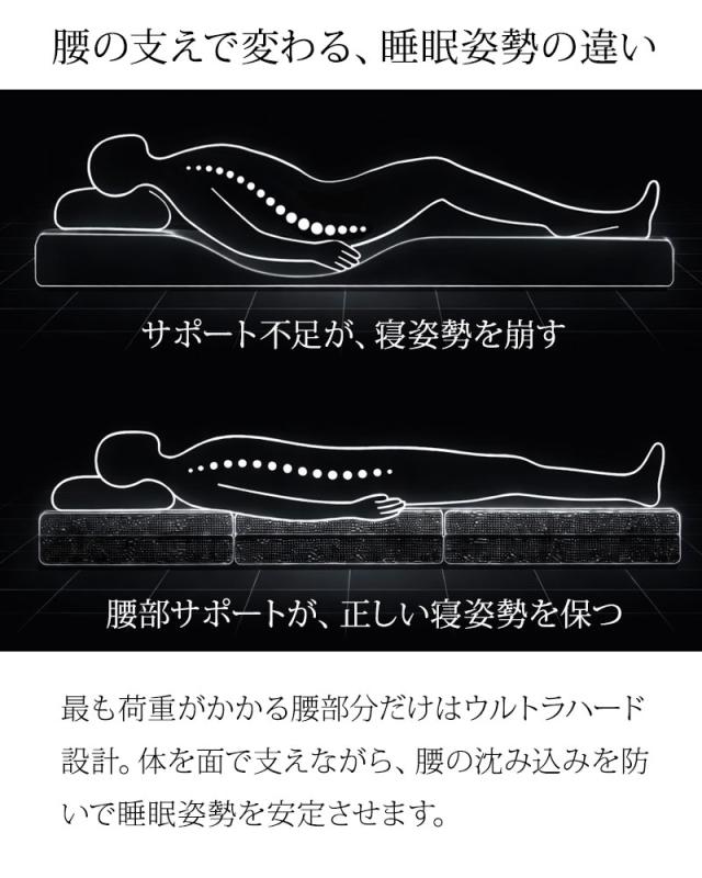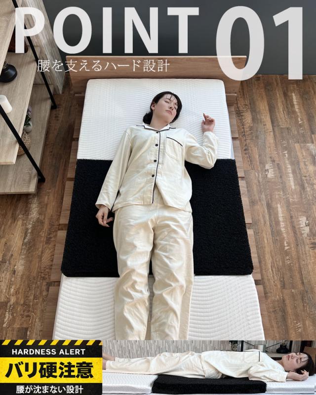 ■圧倒的な支持力!腰が沈まない「超硬質バリ硬」設計 一般的なマットレスを凌駕する「超硬質バリ硬」な寝心地が楽しめる硬めマットレスで、「腰が沈まないウルトラハード」な仕様により、特に負荷のかかりやすい腰部を強力に下から支え、理想的な寝姿勢をキープします。柔らかすぎる寝具で腰痛に悩む方や、がっしりした体格の方でも底付き感なく使用できるタフな構造です。 ■次世代の弾力性「生物模倣クリーパーファイバー」 中材には、植物の蔓(つる)が絡み合う構造をヒントに開発された「生物模倣クリーパーファイバー」を採用しています。この複雑に絡み合った3D構造体が、体圧を分散しつつ、強い反発力で寝返りを軽やかにサポート。まるで空気の上で浮いているような、独特かつ安定したホールド感を実現しています。 ■蒸れ知らずで清潔な「洗える高通気構造」 「洗える高通気構造」により、湿気や熱がこもるのを防ぎます。万が一汚れても中材をシャワーで丸洗いできるため、常に新品のような清潔さを保てます。カバーも取り外してお洗濯でき、三つ折りタイプで収納やお手入れが簡単なのも、日常使いには嬉しいポイントです。 |