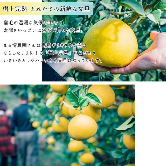 まる博農園さんがございます宿毛地域は、高知県の西南端にあり文旦栽培に適していると言われている海沿いに面しているのが特徴で、黒潮運ぶ潮風と南国土佐の太陽をいっぱい浴びながら土佐文旦を育てられています。土佐文旦は、一般的に年内に収穫して倉庫で追熟するのですが、温暖な気候のこちらの地域は、樹上完熟させることができるのが特徴です。文旦の熟成をおおむね確認して収穫し、美味しくなった「食べごろ」のものを農家さんから直接お客様に出荷しています。樹上完熟文旦のお味はまろやかで、一度食べたらくせになると、今ではリピーターさんが大変多い農家さんです。なお、美味しくなったものから順番に出荷いたしますので、農家指定日より早めの発送をご希望されてもお受けできませんので予めご了承くださいませ。お届きになりましたらすぐにお召し上がりいただけます。