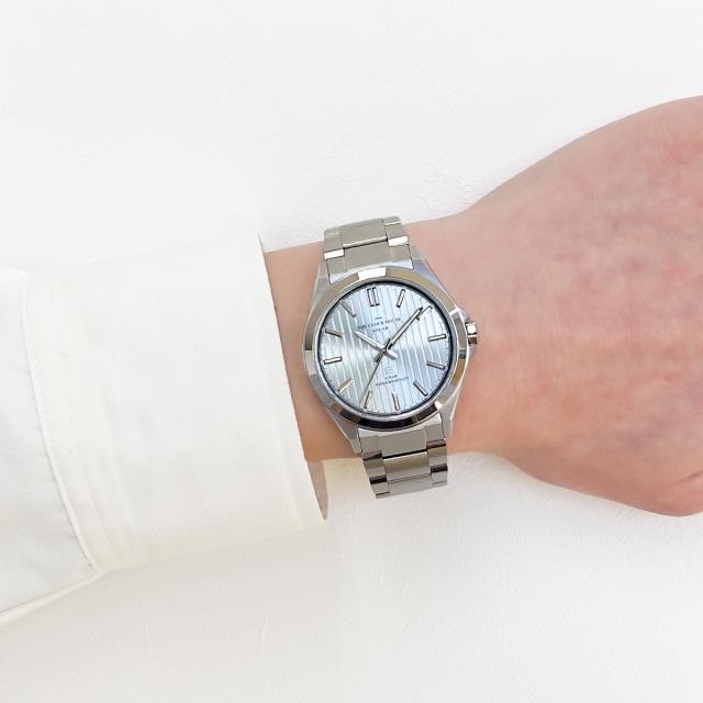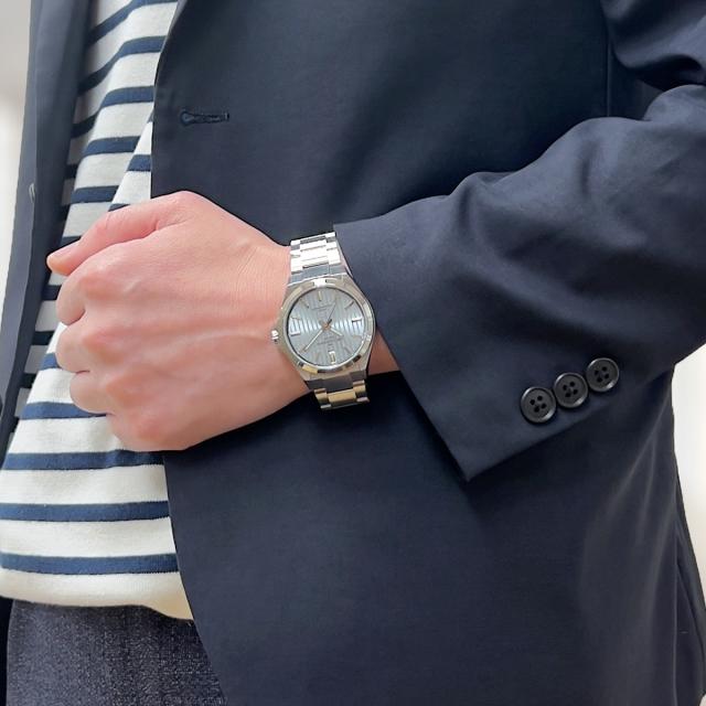 メタルバンドには力強いヘアライン仕上げを施し、ツヤ感を抑えた落ち着いた質感に。直線基調のケースフォルムと相まって、スーツからオフィスカジュアルまで幅広く対応します。