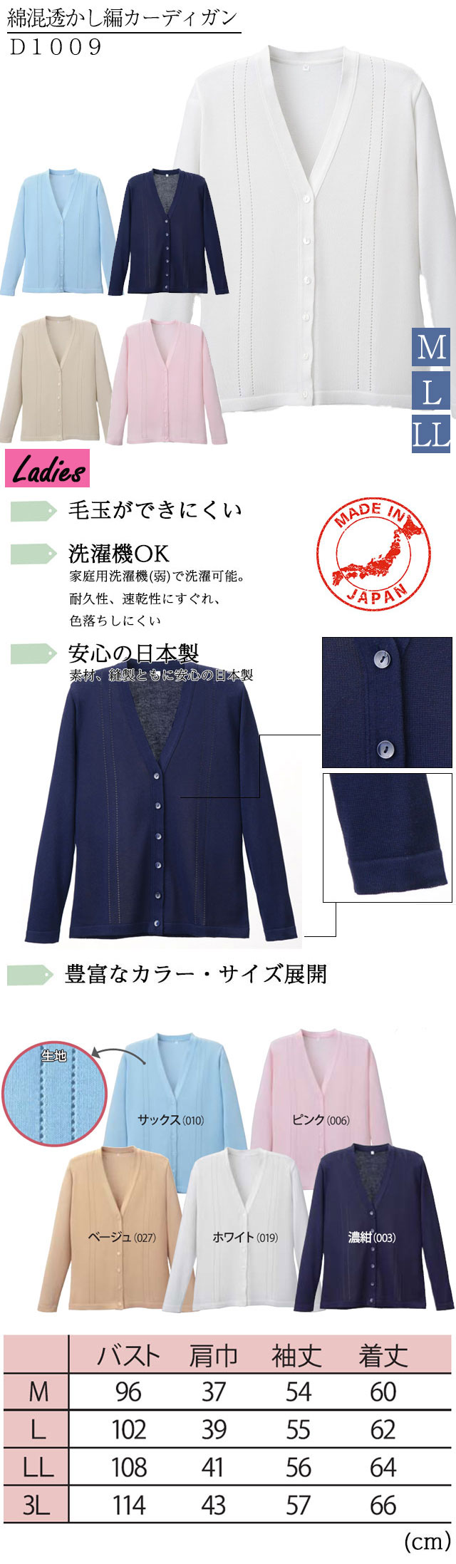綿混透かし編カーディガン D-1009 M/L/LL/3L ディーフェイズ【オフィス カーディガン 夏用 ナース カーディガン 看護 カーディガン 看護カーディガン 医療用カーディガン 事務 カーディガン 学生 制服 事務服 サマーカーディガン レディース】
