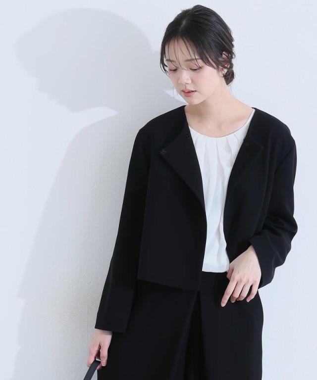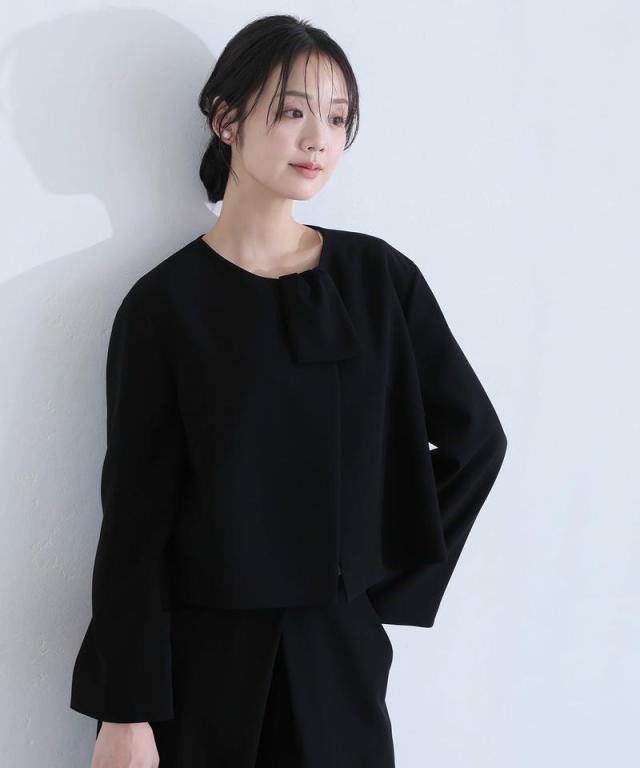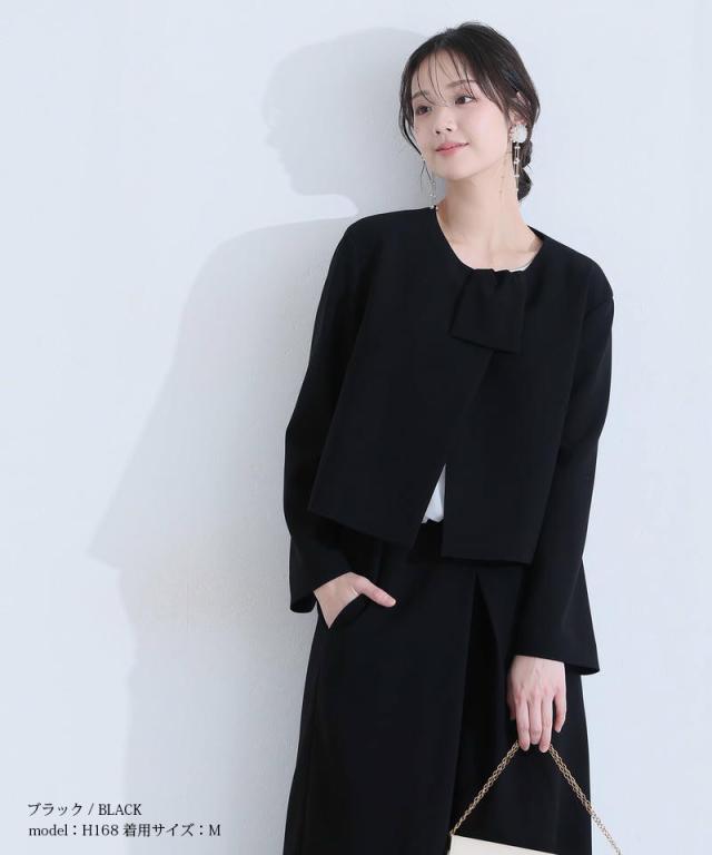 胸元のリボンデザインがさりげない女性らしさを添える、上品なブラックフォーマル。
