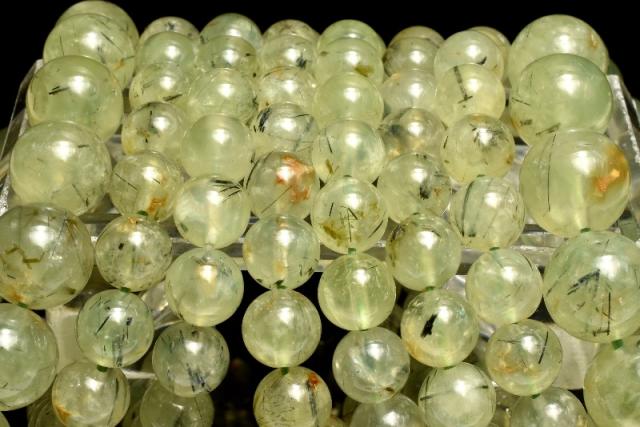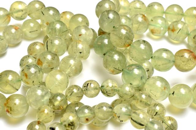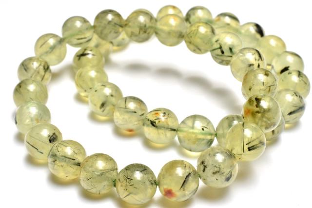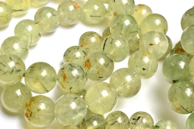 | 特徴・意味 | 内包物のエピドートやライモナイトを観察できるような、ワイルドな印象のブレスレットです。 内包物の入ったプレナイトはヒーリングストーンとして優秀と言われています。 まるでマスカットのようなフルーティーな色合いがとてもみずみずしく、柔らかな印象を抱かせるプレナイト。 和名でぶどう石とも呼ばれるこの石は、本当にぶどうのように見える原石が存在する事に由来します。しかしそのような形状で産出するものは少なく、加工品の多くは塊状の原石から研磨されます。 プレナイトの中にはルチルのようなインクルージョンを含んでいるものも多く流通しており、それらのインクルージョンは一般的にトルマリンと誤認されていますが、大抵の場合はエピドートの針状結晶です。 |
