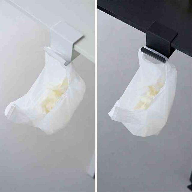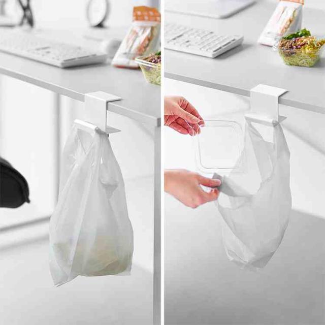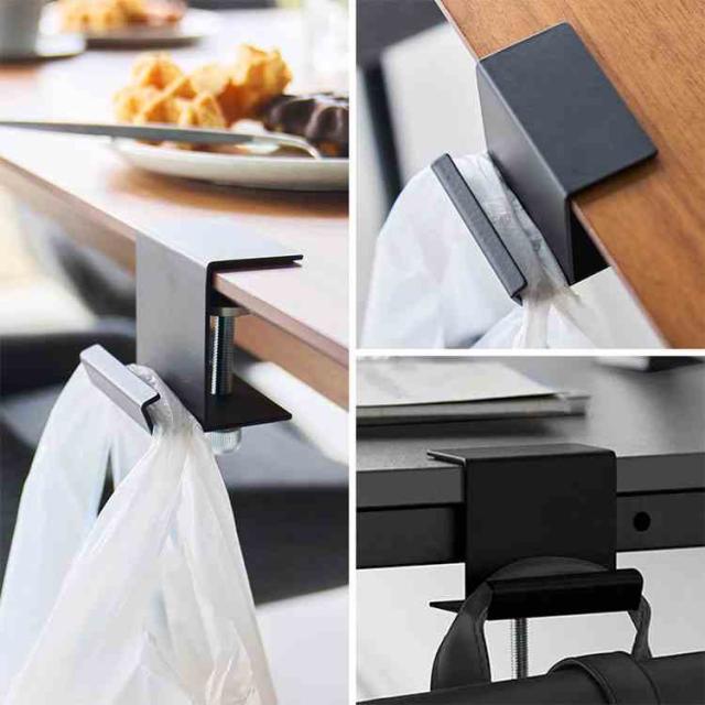 テーブル横にクランプ式でしっかり取り付けられるレジ袋ハンガー。ちょっとしたゴミをサッと捨てられます。