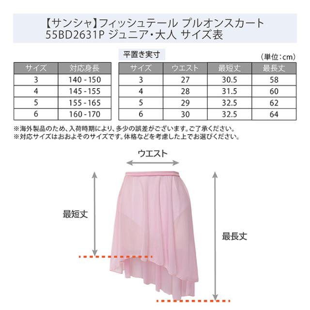 サンシャ フィッシュテール プルオンスカート 55BD2631P ジュニア 大人 バンドスカート ウエストゴム スカート 後ろ下がり シフォン おしゃれ シルエット 脚長 レッスン 練習 着 ブラック 黒 ホワイト 白 ライラック 薄紫 水色 薄青 ピンク 140 145 150 155 160 165 170