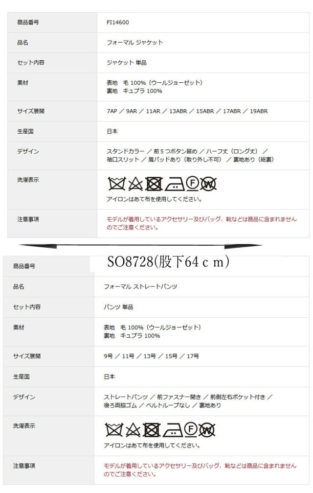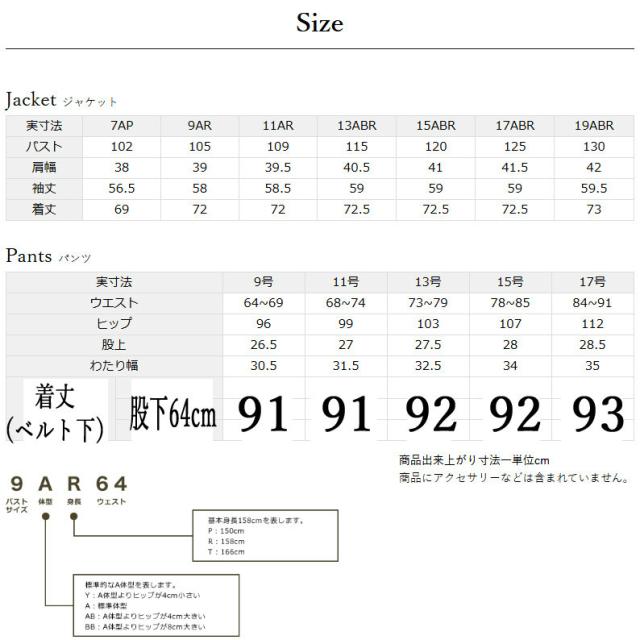 ジャケットのサイズは7号から19号までと、ボトムスのパンツの股下64cmのサイズは各アイテムで9号から17号まで展開しており、上下の異なるサイズを選べ、かつ幅広い体型に対応できるスーツです。