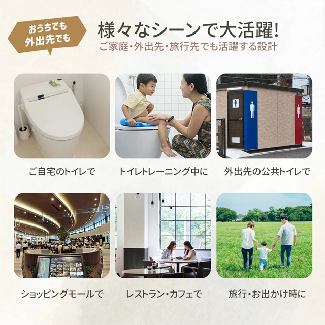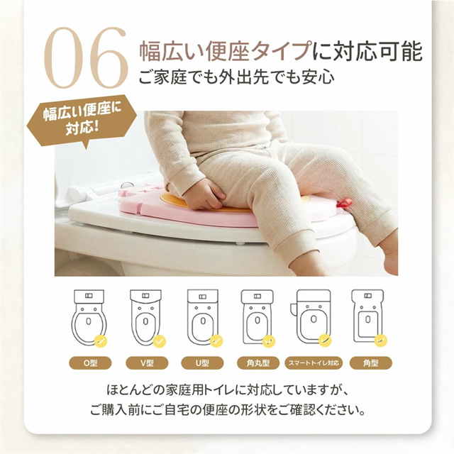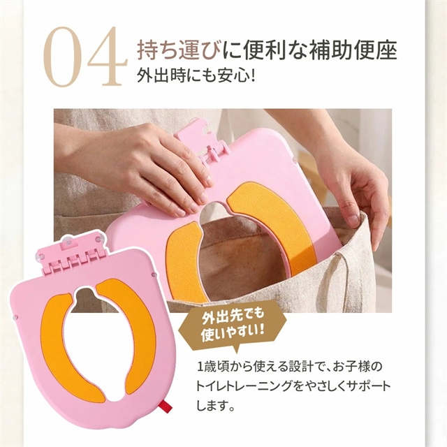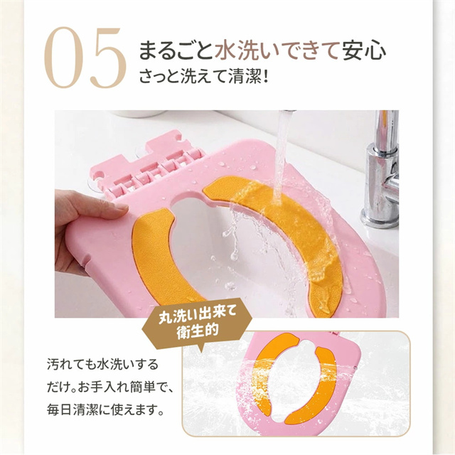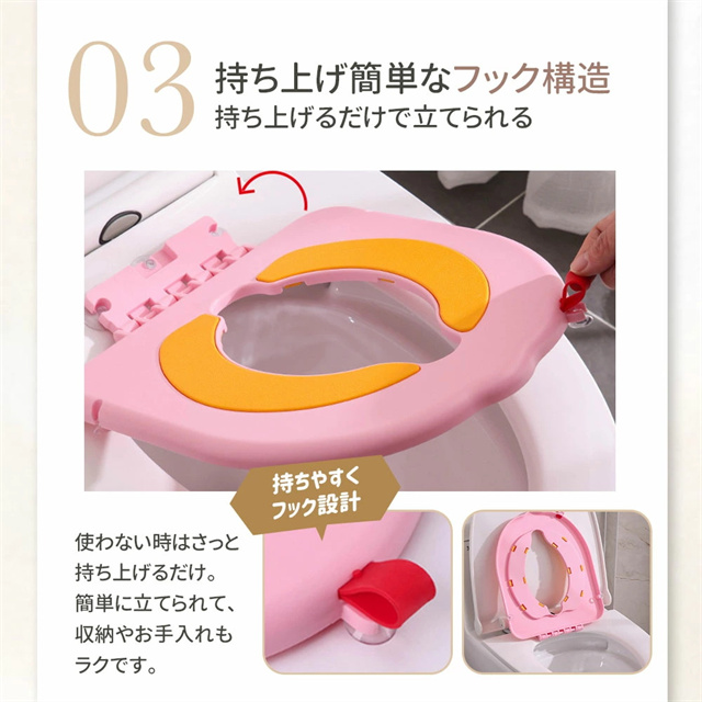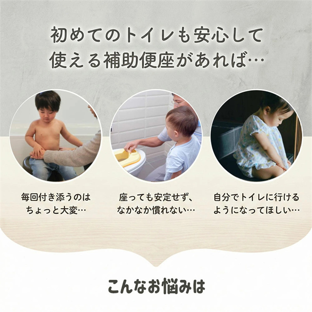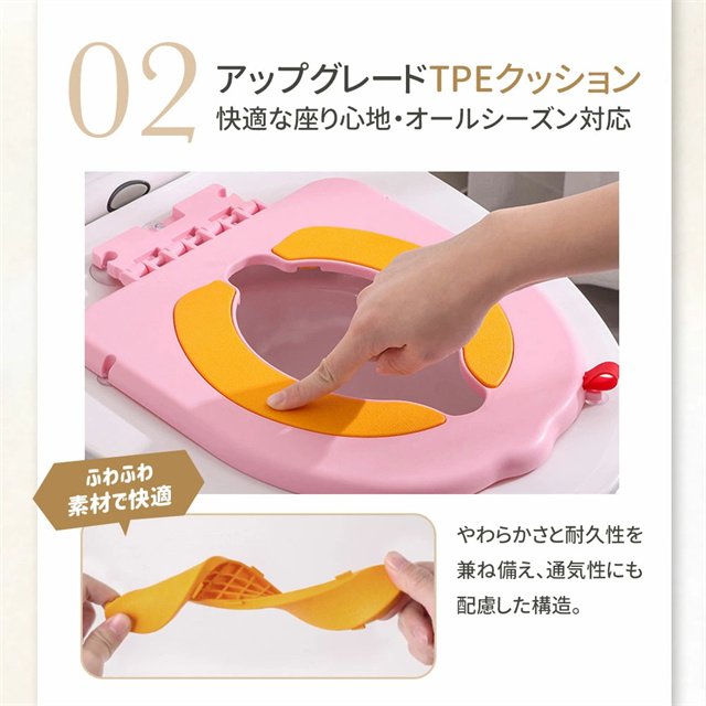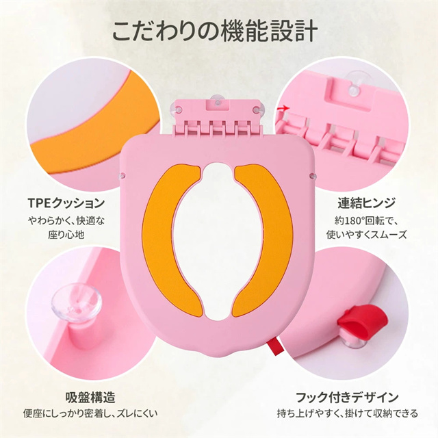 | 特徴 | トイレに設置する、コンパクトな子供用補助便座です。 便座に吸着させるだけで簡単に装着でき、お子さまが使わない時は立てておけば邪魔にならないので、付けっぱなしでOK。 座面にはTPE素材クッションを採用し、柔らかく座りやすい設計。丸ごと水洗いできるので、毎日清潔。 踏み台を併用すれば幼児期から長く使え、年の離れた兄弟でも共用しやすいのも魅力です。 |