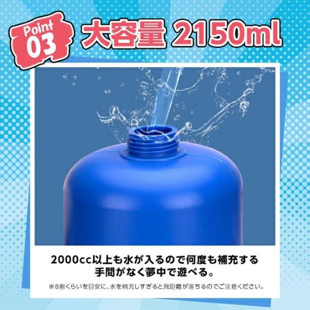 2000cc以上も水が入るので何度も補充する手間がなく夢中で遊べる。※8割くらいを目安に、水を補充しすぎると飛距離が落ちるのでご注意ください。