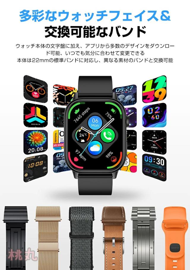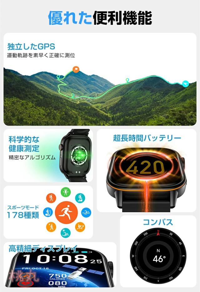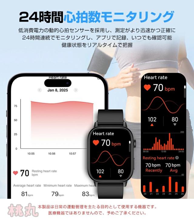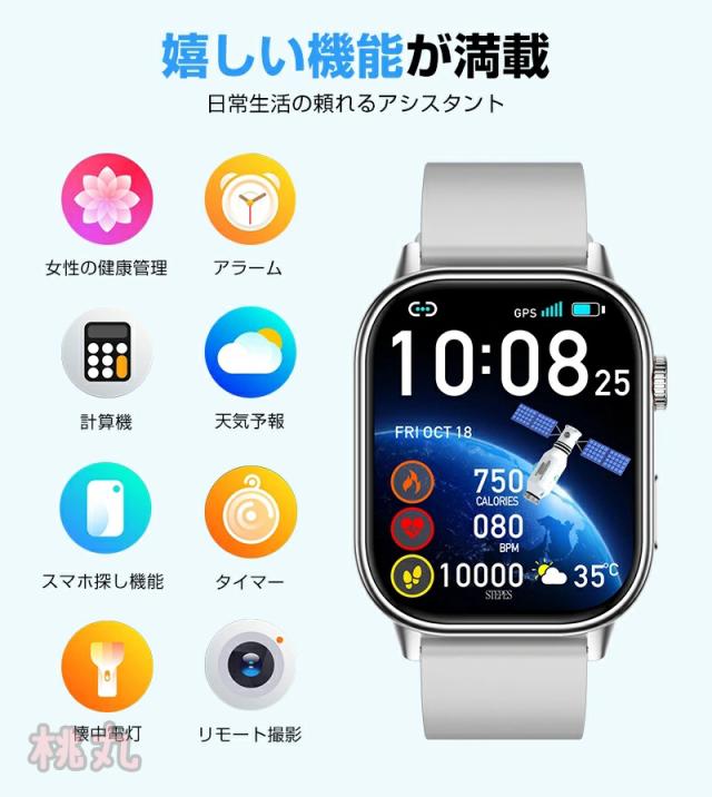 心拍計、活動量計、歩数計、Bluetooth通話機能、座りがちの自動注意、睡眠モニター、SMS通知、電話の着信通知、生理管理機能、アラーム、データ同期、データ分析。 時計機能はもちろん、 iPhoneやAndroidなどスマホとBluetoothで接続すれば、心拍数、走行距離、カロリー消費、睡眠モニター など日々の様々な活動量の計測が可能です。