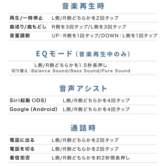 ●タッチ操作は、音楽の再生/停止、曲送り/戻し、音量調整、通話操作、音声アシスタント起動に対応します。