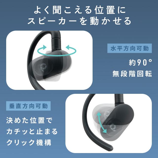 ●着けていることを忘れるフィット感!上下左右に可動するイヤーフックを搭載したオープンイヤー型Bluetoothイヤホンです。●イヤーフック部分は柔らかく、さらに上下左右に可動するので耳の大きさに合わせて自由にサイズ調整ができます。